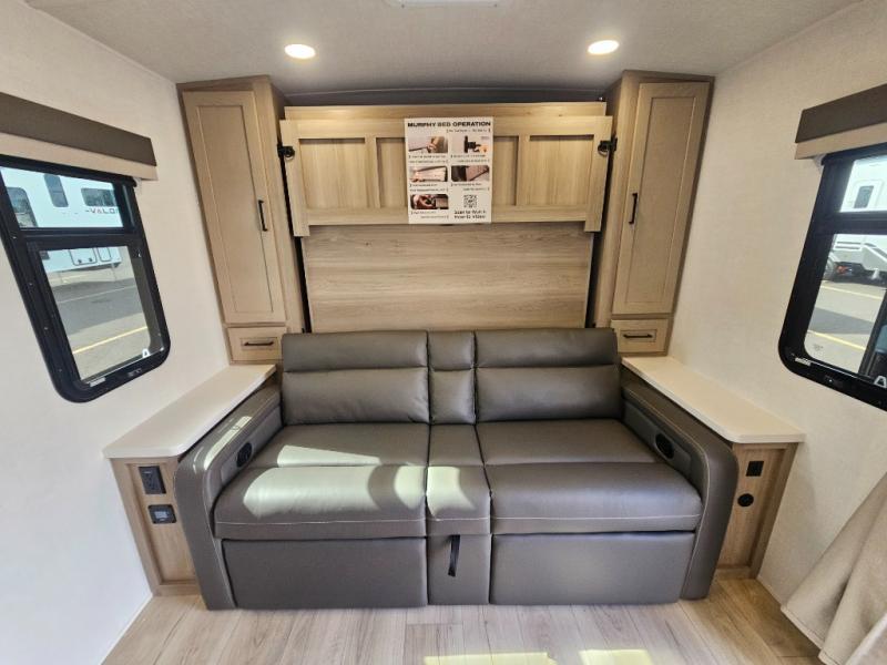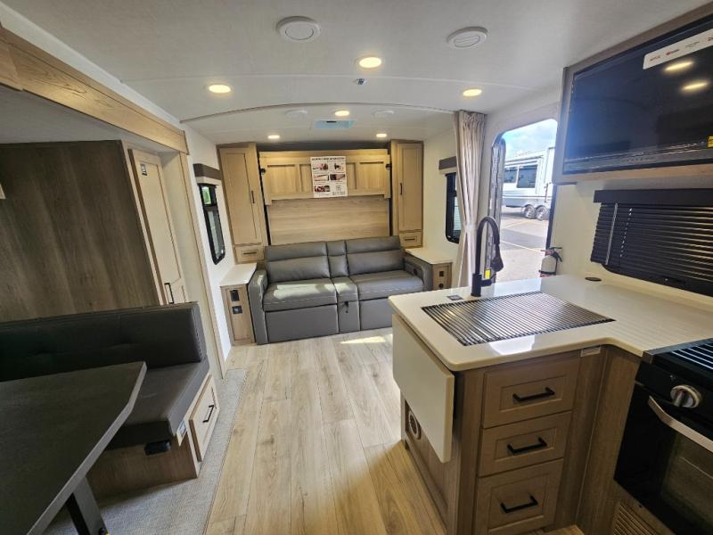 You'll love camping in this single slide out travel trailer that can sleep four each night! Up front, you'll find the 74" sofa where you can relax each day, then fold down the Murphy bed in the evening for a great night's rest. There is also a privacy curtain here if you have guests staying over on the U-shaped dinette within the slide out, and the TV means you all can watch a movie at night. The full rear bath includes a spacious shower to freshen up, along with a toilet, sink, and bath linen closet for towels!