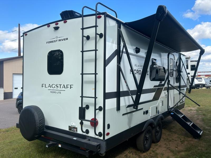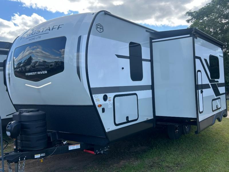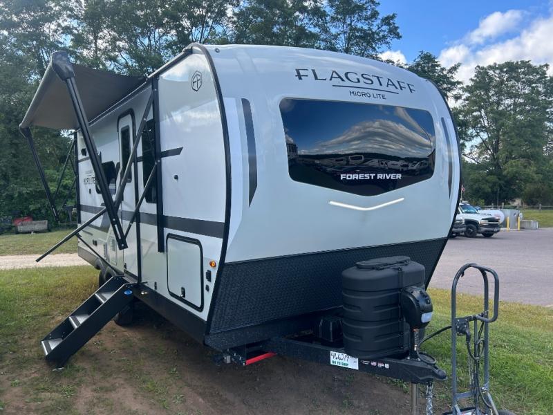With any Flagstaff Micro Lite travel trailer by Forest River you will enjoy lightweight towing, durable construction, and added interior comforts to make each trip memorable! Each model features RoadTech tire pressure monitoring, Dexter Torflex axles, and nitrogen-filled Goodyear endurance tires for smooth towing from home to campground. The 6-sided aluminum framed construction provides a strong foundation so you can enjoy your RV for years to come, plus the radiant foil in the front cap, underbelly and slides help insulate your trailer. Additional exterior features include a 200W solar panel, back-up camera prep, frameless windows, and slam baggage doors. Each model includes the Great Expectations Package with roller shades, solid surface kitchen countertops, and hidden hinge cabinet doors. There is also an exterior hot/cold water port, outside speakers, a power tongue jack and stabilizer jacks, plus many more conveniences.