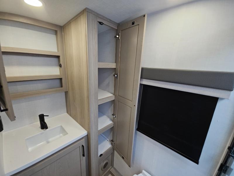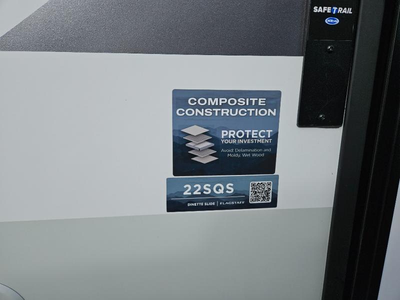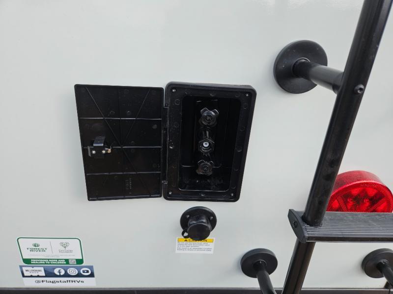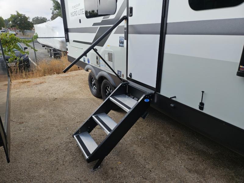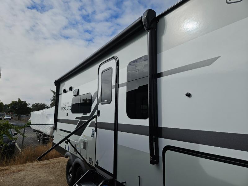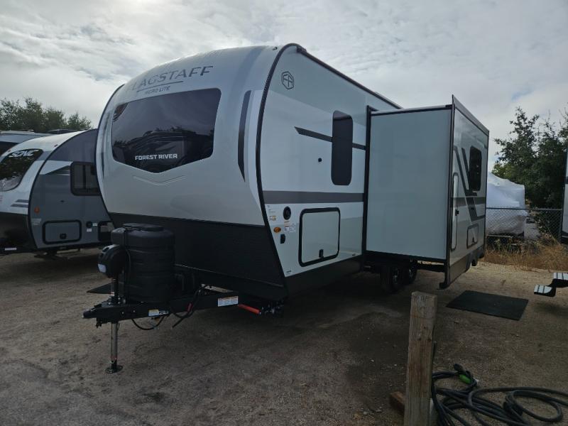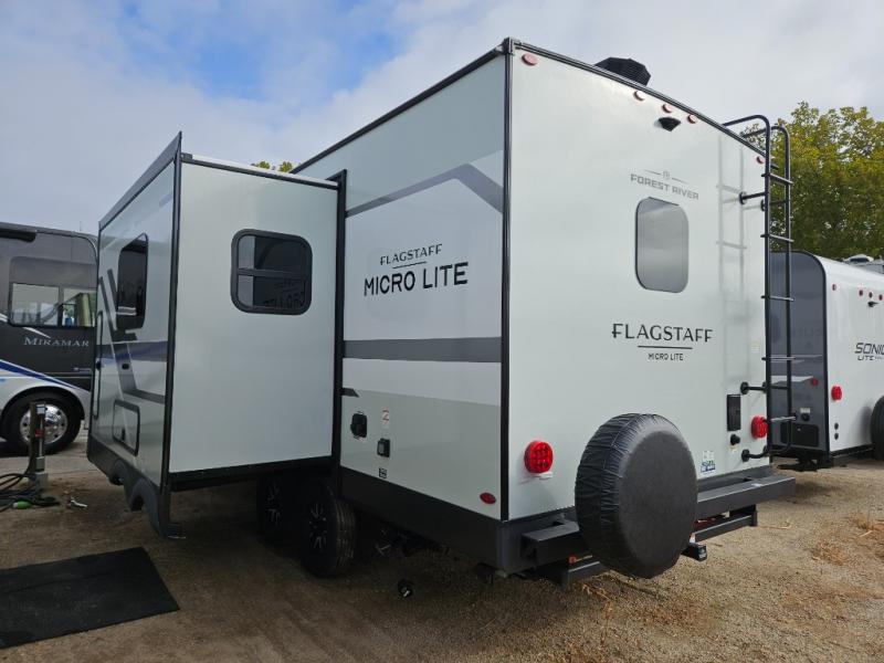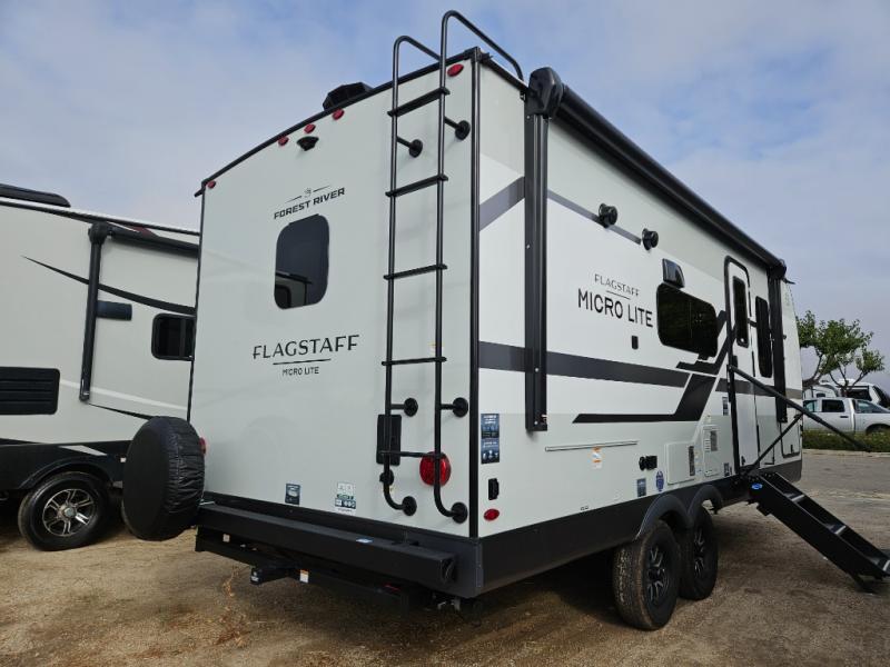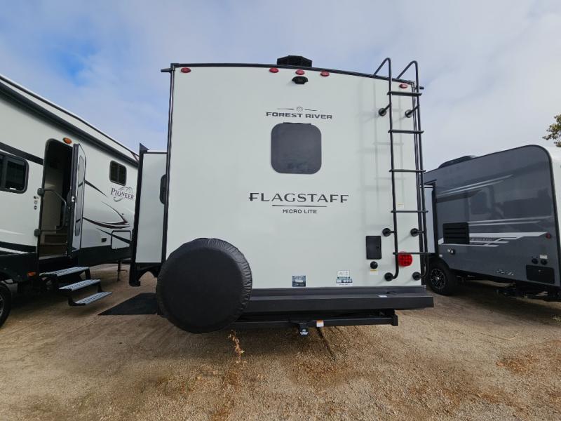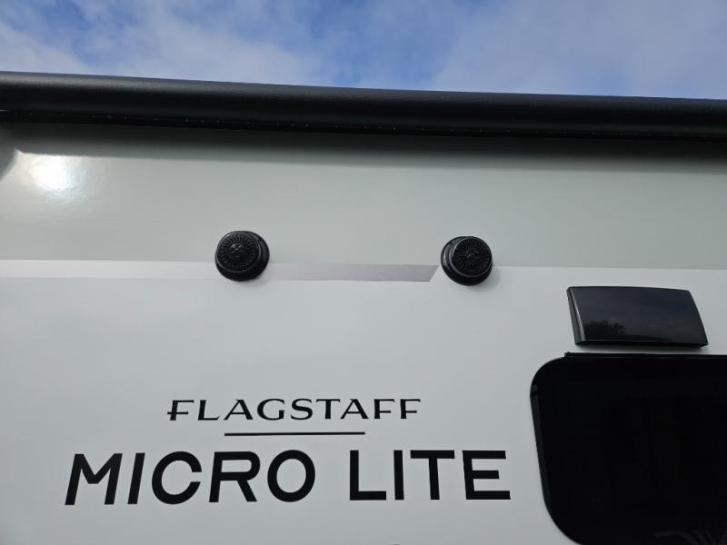 With any Flagstaff Micro Lite travel trailer by Forest River you will enjoy lightweight towing, durable construction, and added interior comforts to make each trip memorable! Each model features RoadTech tire pressure monitoring, Dexter Torflex axles, and nitrogen-filled Goodyear endurance tires for smooth towing from home to campground. The 6-sided aluminum framed construction provides a strong foundation so you can enjoy your RV for years to come, plus the radiant foil in the front cap, underbelly and slides help insulate your trailer. Additional exterior features include a 200W solar panel, back-up camera prep, frameless windows, and slam baggage doors. Each model includes the Great Expectations Package with roller shades, solid surface kitchen countertops, and hidden hinge cabinet doors. There is also an exterior hot/cold water port, outside speakers, a power tongue jack and stabilizer jacks, plus many more conveniences.