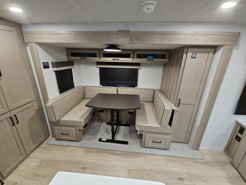 You'll love camping in this single slide out travel trailer that can sleep four each night! Up front, you'll find the 74" sofa where you can relax each day, then fold down the Murphy bed in the evening for a great night's rest. There is also a privacy curtain here if you have guests staying over on the U-shaped dinette within the slide out, and the TV means you all can watch a movie at night. The full rear bath includes a spacious shower to freshen up, along with a toilet, sink, and bath linen closet for towels!