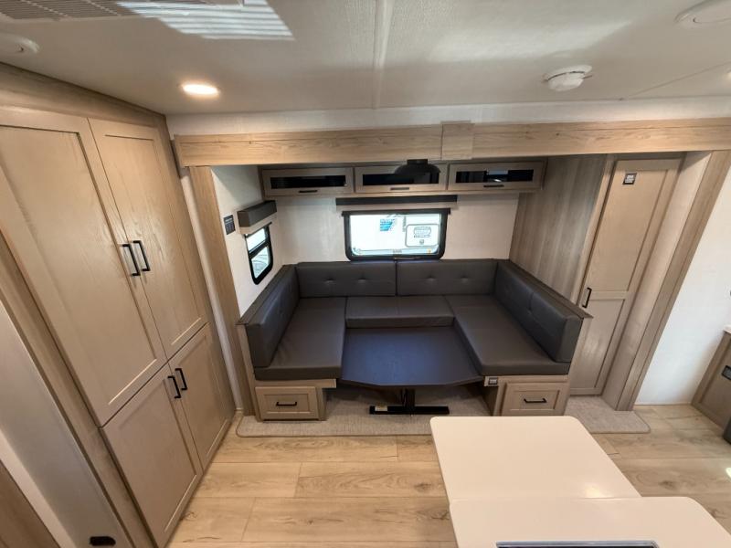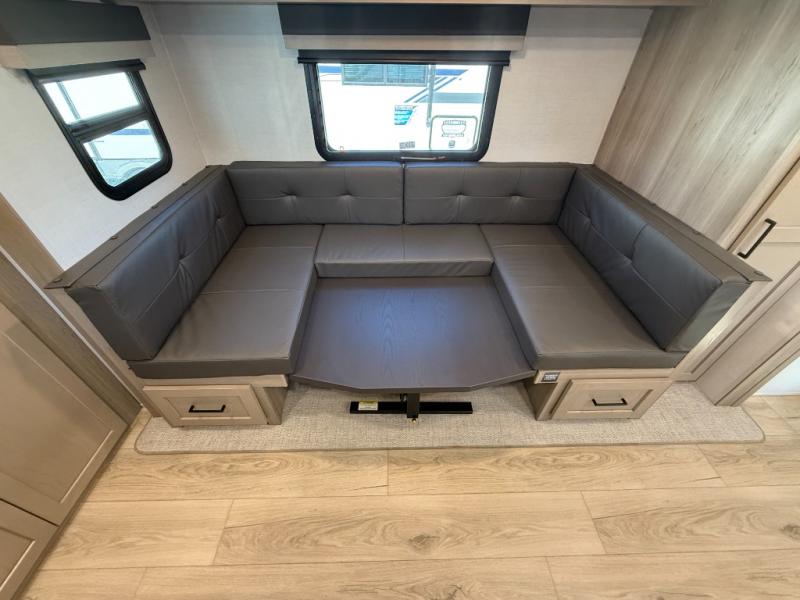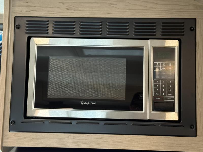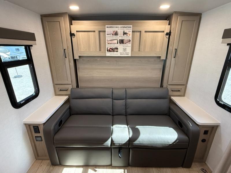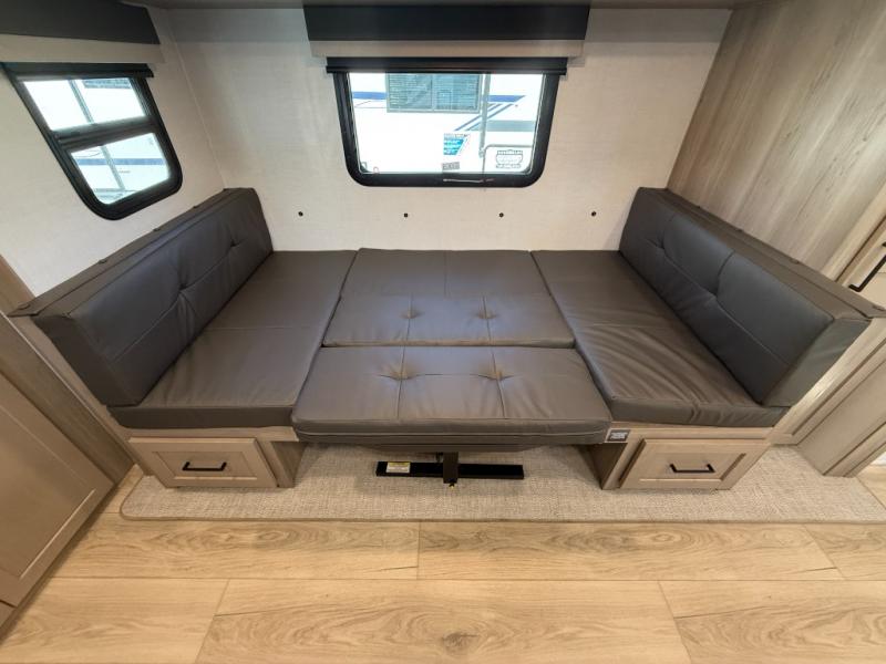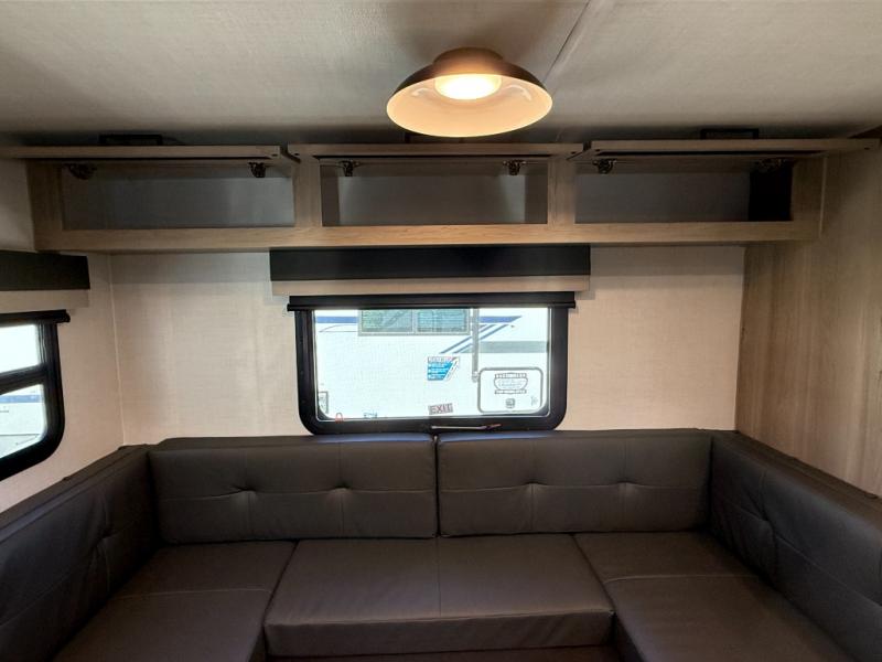 You'll love camping in this single slide out travel trailer that can sleep four each night! Up front, you'll find the 74" sofa where you can relax each day, then fold down the Murphy bed in the evening for a great night's rest. There is also a privacy curtain here if you have guests staying over on the U-shaped dinette within the slide out, and the TV means you all can watch a movie at night. The full rear bath includes a spacious shower to freshen up, along with a toilet, sink, and bath linen closet for towels!