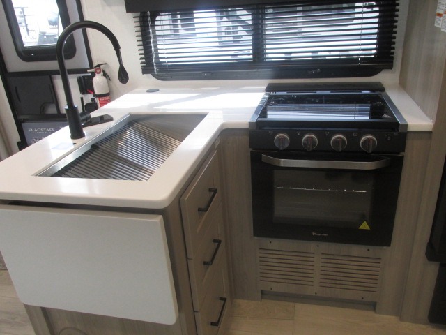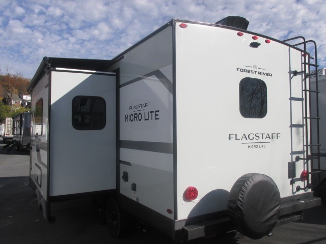 With any Flagstaff Micro Lite travel trailer by Forest River you will enjoy lightweight towing, durable construction, and added interior comforts to make each trip memorable! Each model features RoadTech tire pressure monitoring, Dexter Torflex axles, and nitrogen-filled Goodyear endurance tires for smooth towing from home to campground. The 6-sided aluminum framed construction provides a strong foundation so you can enjoy your RV for years to come, plus the radiant foil in the front cap, underbelly and slides help insulate your trailer. Additional exterior features include a 200W solar panel, back-up camera prep, frameless windows, and slam baggage doors. Each model includes the Great Expectations Package with roller shades, solid surface kitchen countertops, and hidden hinge cabinet doors. There is also an exterior hot/cold water port, outside speakers, a power tongue jack and stabilizer jacks, plus many more conveniences.