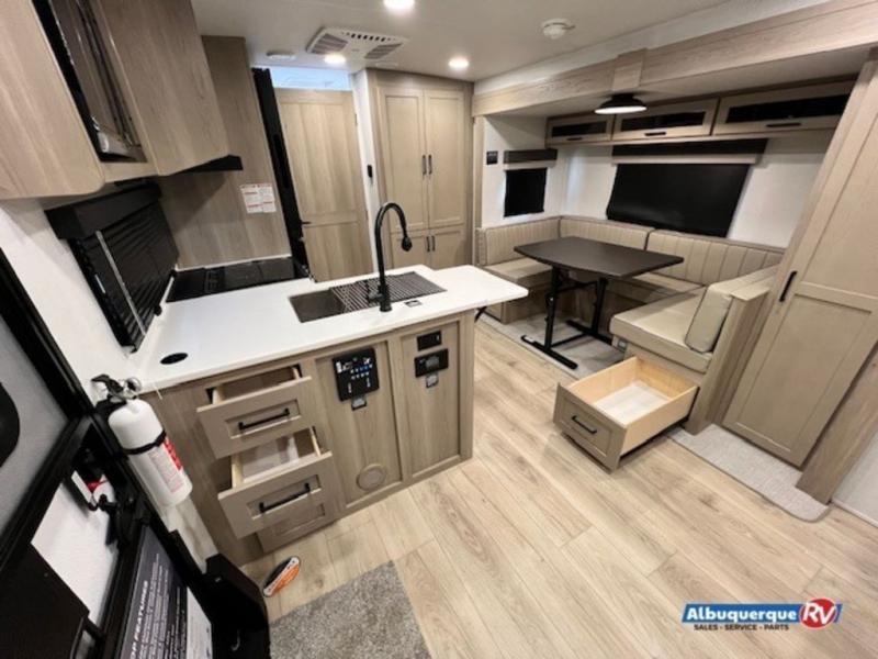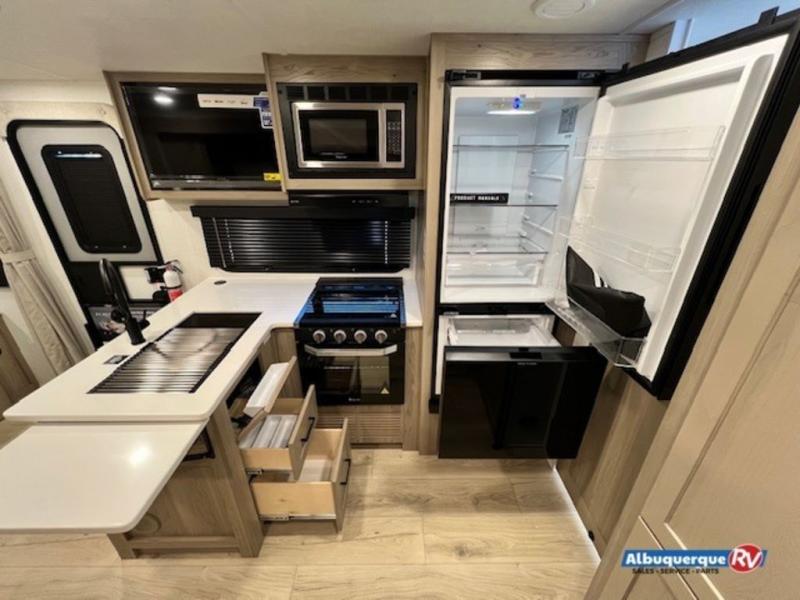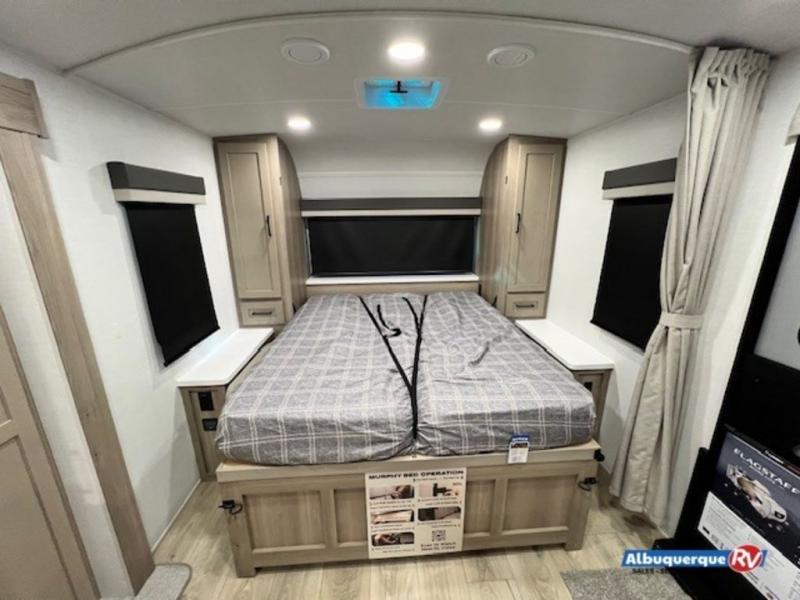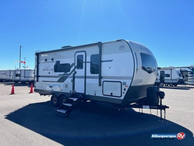 With any Flagstaff Micro Lite travel trailer by Forest River you will enjoy lightweight towing, durable construction, and added interior comforts to make each trip memorable! Each model features RoadTech tire pressure monitoring, Dexter Torflex axles, and nitrogen-filled Goodyear endurance tires for smooth towing from home to campground. The 6-sided aluminum framed construction provides a strong foundation so you can enjoy your RV for years to come, plus the radiant foil in the front cap, underbelly and slides help insulate your trailer. Additional exterior features include a 200W solar panel, back-up camera prep, frameless windows, and slam baggage doors. Each model includes the Great Expectations Package with roller shades, solid surface kitchen countertops, and hidden hinge cabinet doors. There is also an exterior hot/cold water port, outside speakers, a power tongue jack and stabilizer jacks, plus many more conveniences.