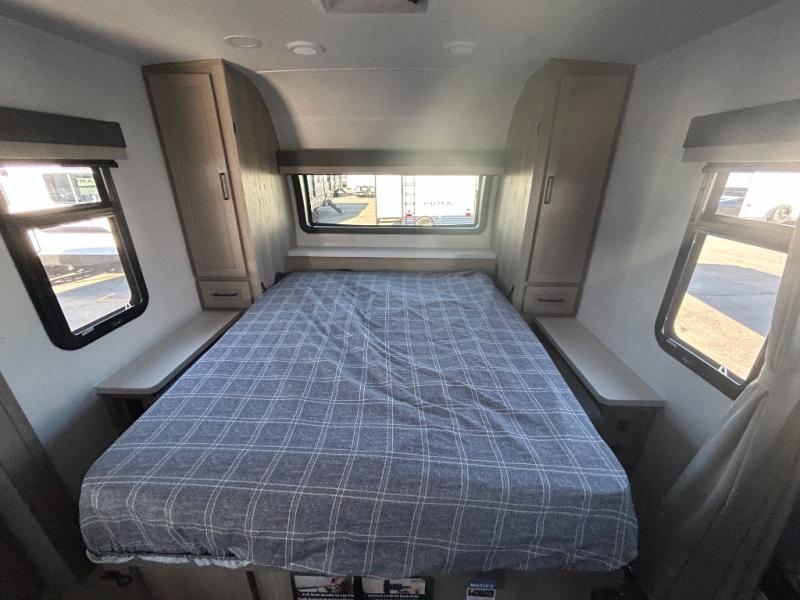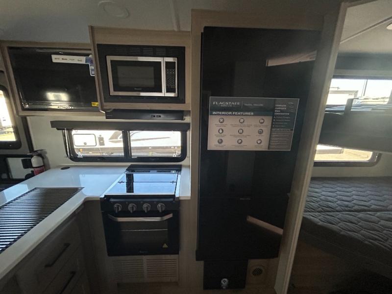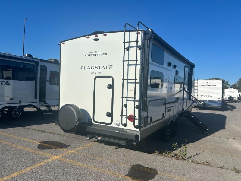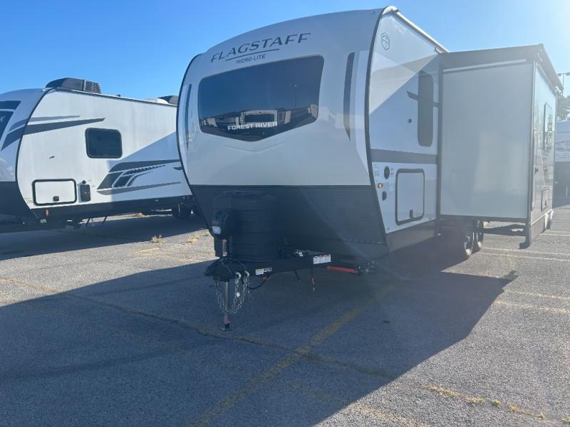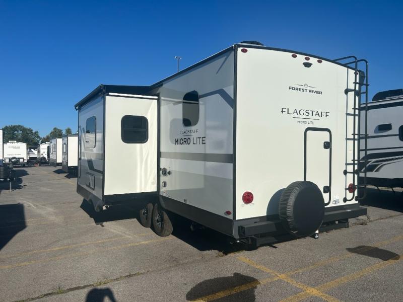 With any Flagstaff Micro Lite travel trailer by Forest River you will enjoy lightweight towing, durable construction, and added interior comforts to make each trip memorable! Each model features RoadTech tire pressure monitoring, Dexter Torflex axles, and nitrogen-filled Goodyear endurance tires for smooth towing from home to campground. The 6-sided aluminum framed construction provides a strong foundation so you can enjoy your RV for years to come, plus the radiant foil in the front cap, underbelly and slides help insulate your trailer. Additional exterior features include a 200W solar panel, back-up camera prep, frameless windows, and slam baggage doors. Each model includes the Great Expectations Package with roller shades, solid surface kitchen countertops, and hidden hinge cabinet doors. There is also an exterior hot/cold water port, outside speakers, a power tongue jack and stabilizer jacks, plus many more conveniences.