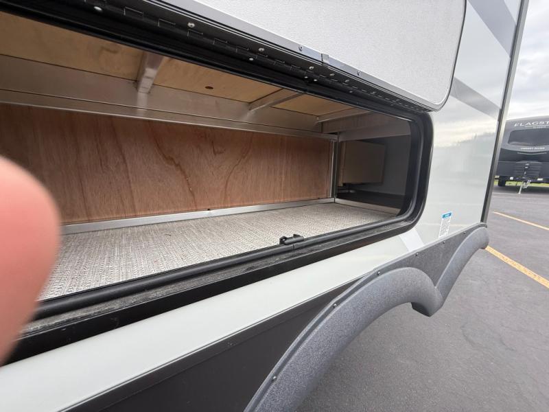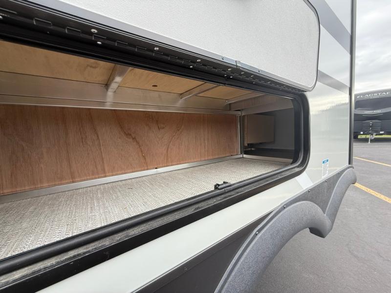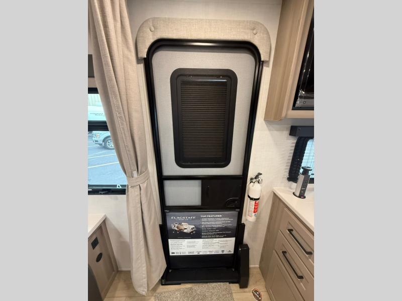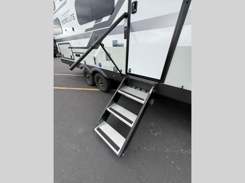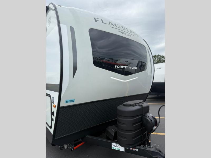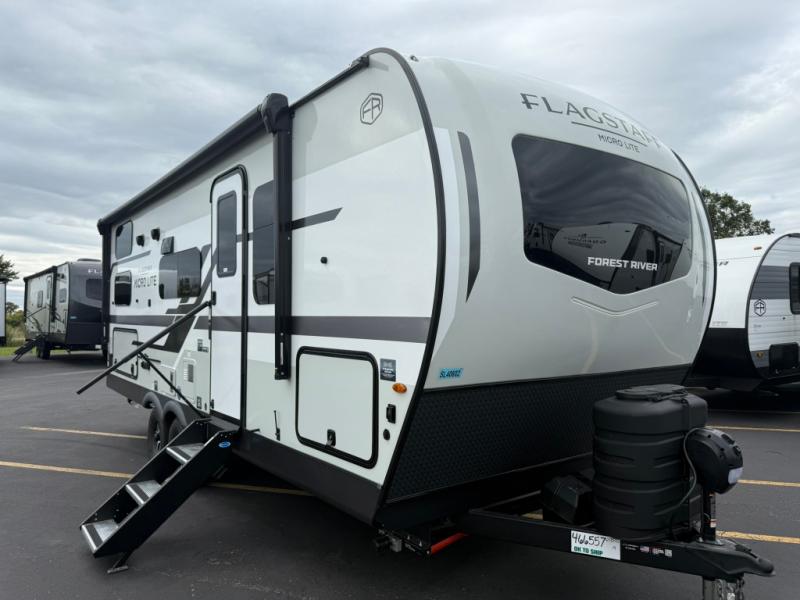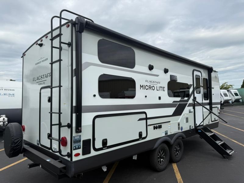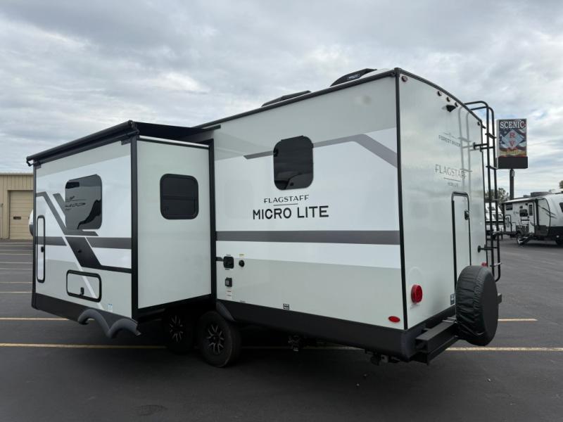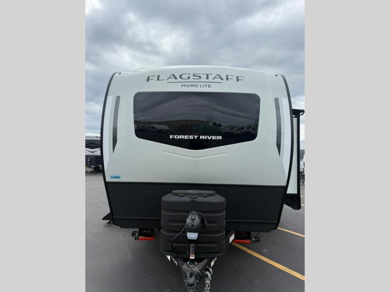 With any Flagstaff Micro Lite travel trailer by Forest River you will enjoy lightweight towing, durable construction, and added interior comforts to make each trip memorable! Each model features RoadTech tire pressure monitoring, Dexter Torflex axles, and nitrogen-filled Goodyear endurance tires for smooth towing from home to campground. The 6-sided aluminum framed construction provides a strong foundation so you can enjoy your RV for years to come, plus the radiant foil in the front cap, underbelly and slides help insulate your trailer. Additional exterior features include a 200W solar panel, back-up camera prep, frameless windows, and slam baggage doors. Each model includes the Great Expectations Package with roller shades, solid surface kitchen countertops, and hidden hinge cabinet doors. There is also an exterior hot/cold water port, outside speakers, a power tongue jack and stabilizer jacks, plus many more conveniences.