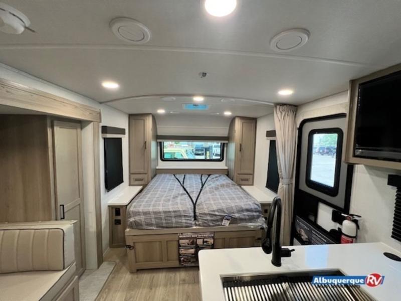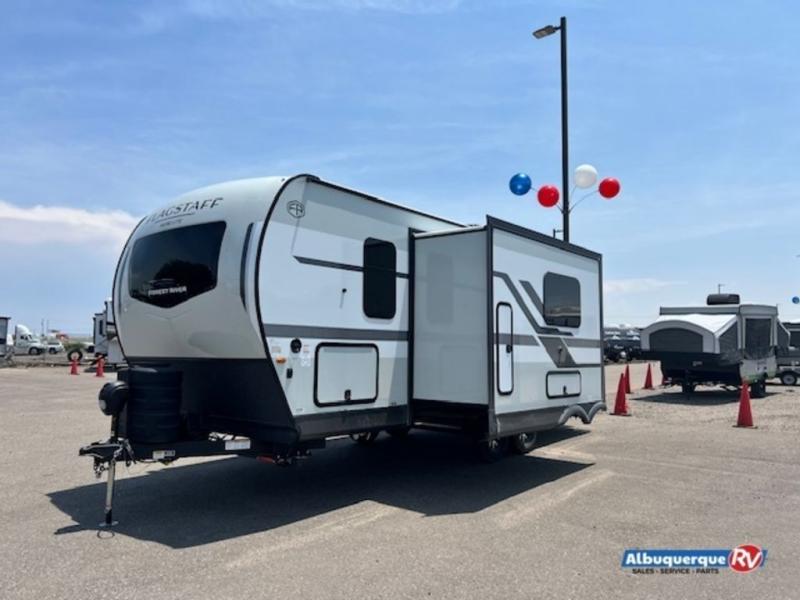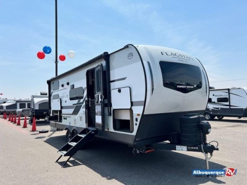 With any Flagstaff Micro Lite travel trailer by Forest River you will enjoy lightweight towing, durable construction, and added interior comforts to make each trip memorable! Each model features RoadTech tire pressure monitoring, Dexter Torflex axles, and nitrogen-filled Goodyear endurance tires for smooth towing from home to campground. The 6-sided aluminum framed construction provides a strong foundation so you can enjoy your RV for years to come, plus the radiant foil in the front cap, underbelly and slides help insulate your trailer. Additional exterior features include a 200W solar panel, back-up camera prep, frameless windows, and slam baggage doors. Each model includes the Great Expectations Package with roller shades, solid surface kitchen countertops, and hidden hinge cabinet doors. There is also an exterior hot/cold water port, outside speakers, a power tongue jack and stabilizer jacks, plus many more conveniences.