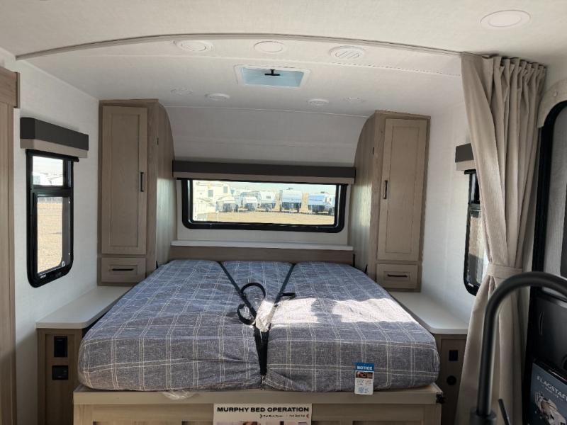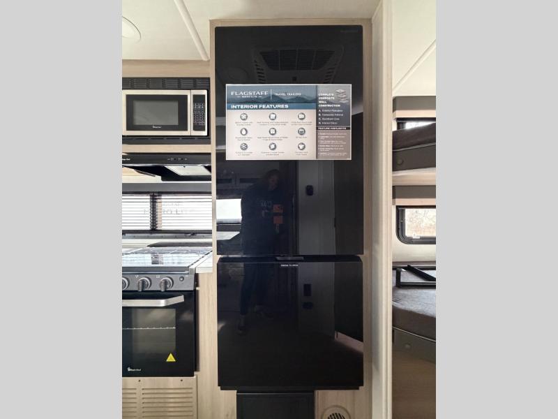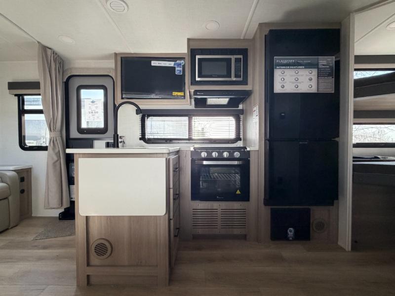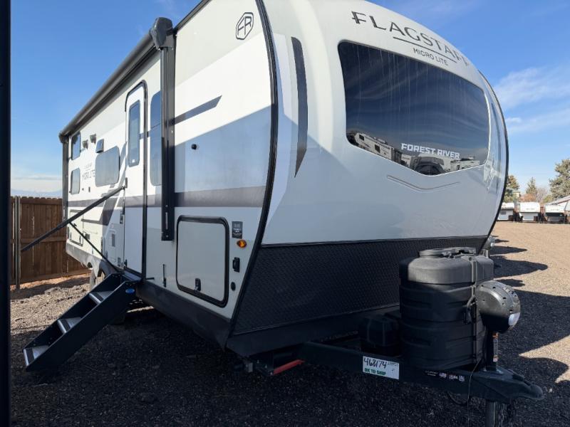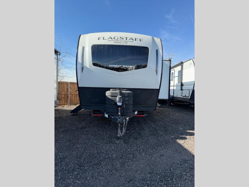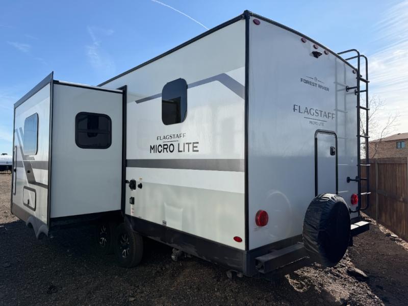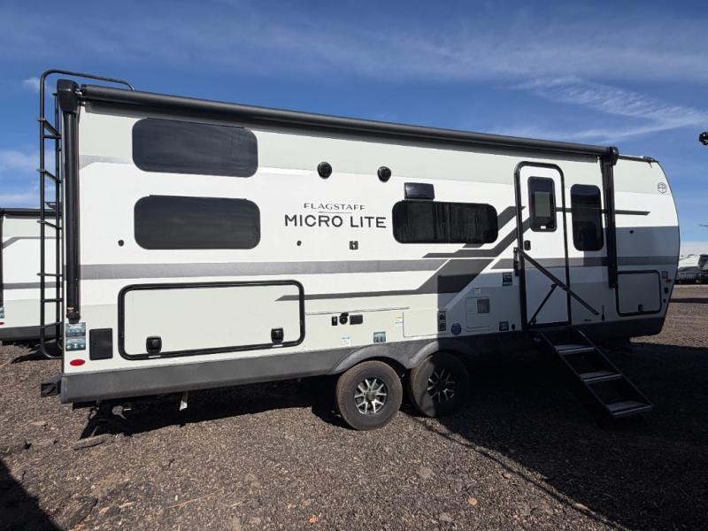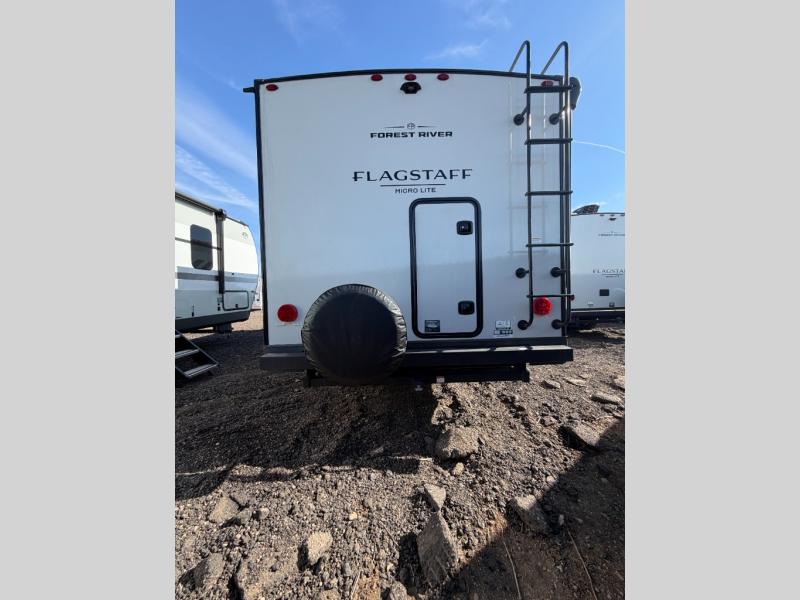 With any Flagstaff Micro Lite travel trailer by Forest River you will enjoy lightweight towing, durable construction, and added interior comforts to make each trip memorable! Each model features RoadTech tire pressure monitoring, Dexter Torflex axles, and nitrogen-filled Goodyear endurance tires for smooth towing from home to campground. The 6-sided aluminum framed construction provides a strong foundation so you can enjoy your RV for years to come, plus the radiant foil in the front cap, underbelly and slides help insulate your trailer. Additional exterior features include a 200W solar panel, back-up camera prep, frameless windows, and slam baggage doors. Each model includes the Great Expectations Package with roller shades, solid surface kitchen countertops, and hidden hinge cabinet doors. There is also an exterior hot/cold water port, outside speakers, a power tongue jack and stabilizer jacks, plus many more conveniences.