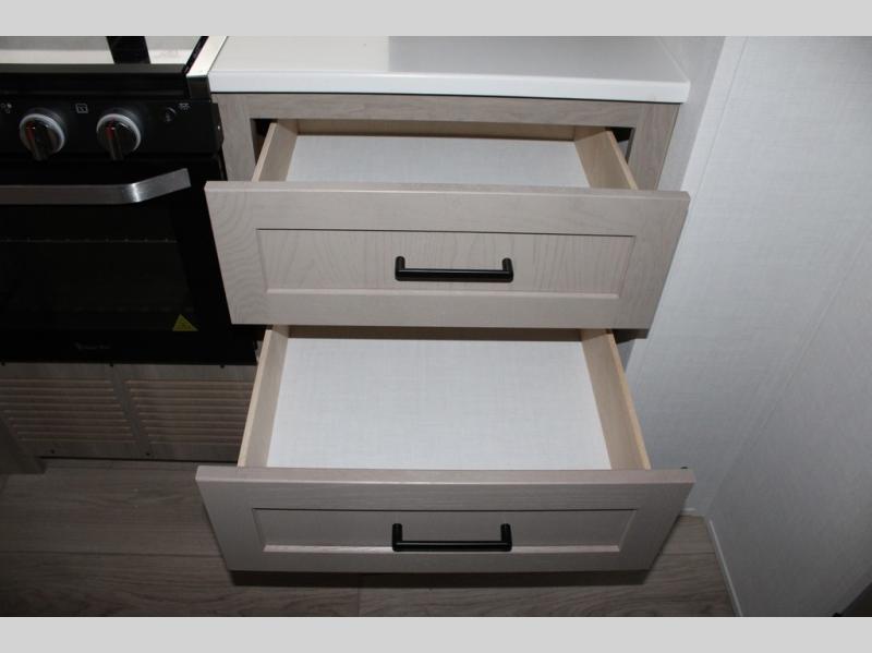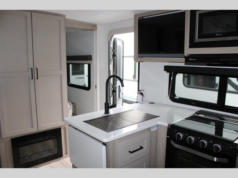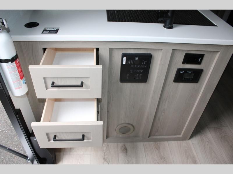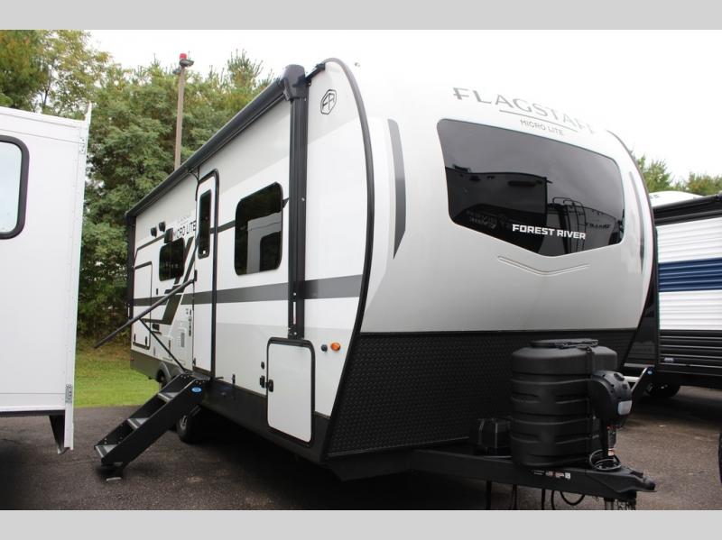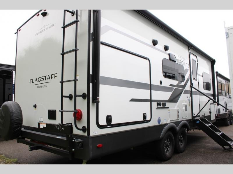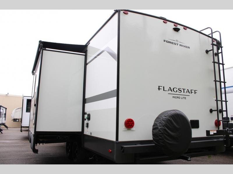 With any Flagstaff Micro Lite travel trailer by Forest River you will enjoy lightweight towing, durable construction, and added interior comforts to make each trip memorable! Each model features RoadTech tire pressure monitoring, Dexter Torflex axles, and nitrogen-filled Goodyear endurance tires for smooth towing from home to campground. The 6-sided aluminum framed construction provides a strong foundation so you can enjoy your RV for years to come, plus the radiant foil in the front cap, underbelly and slides help insulate your trailer. Additional exterior features include a 200W solar panel, back-up camera prep, frameless windows, and slam baggage doors. Each model includes the Great Expectations Package with roller shades, solid surface kitchen countertops, and hidden hinge cabinet doors. There is also an exterior hot/cold water port, outside speakers, a power tongue jack and stabilizer jacks, plus many more conveniences.