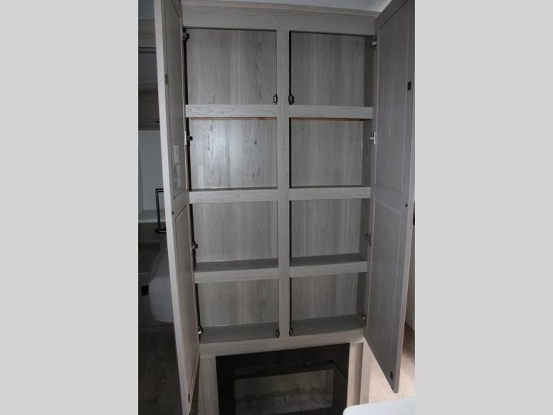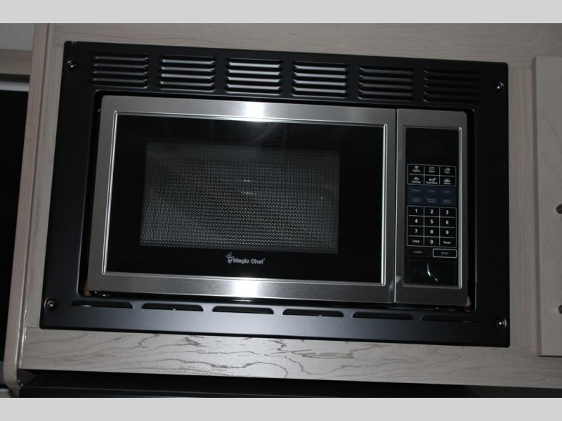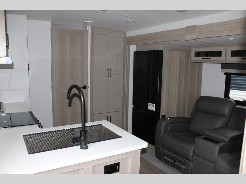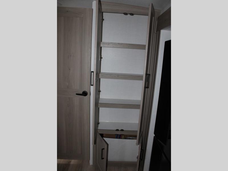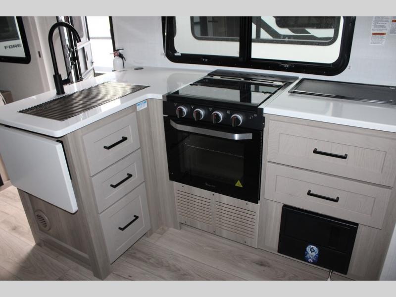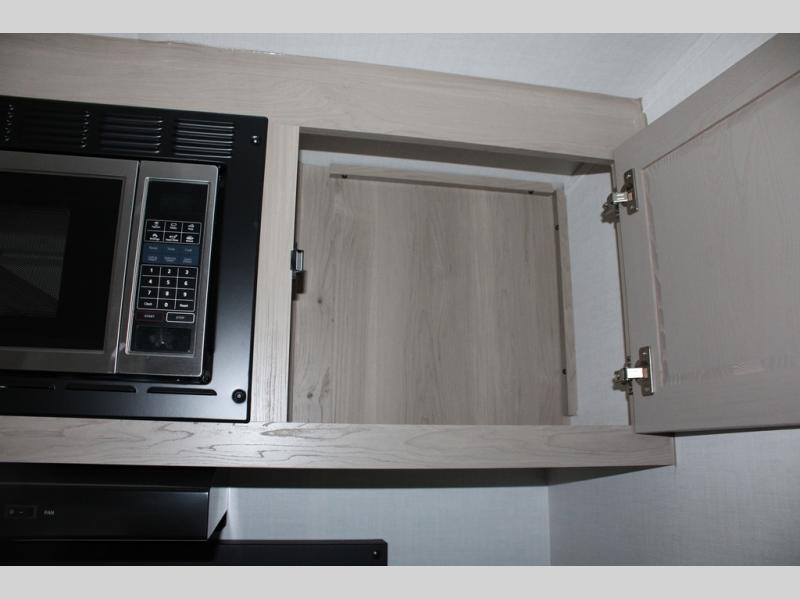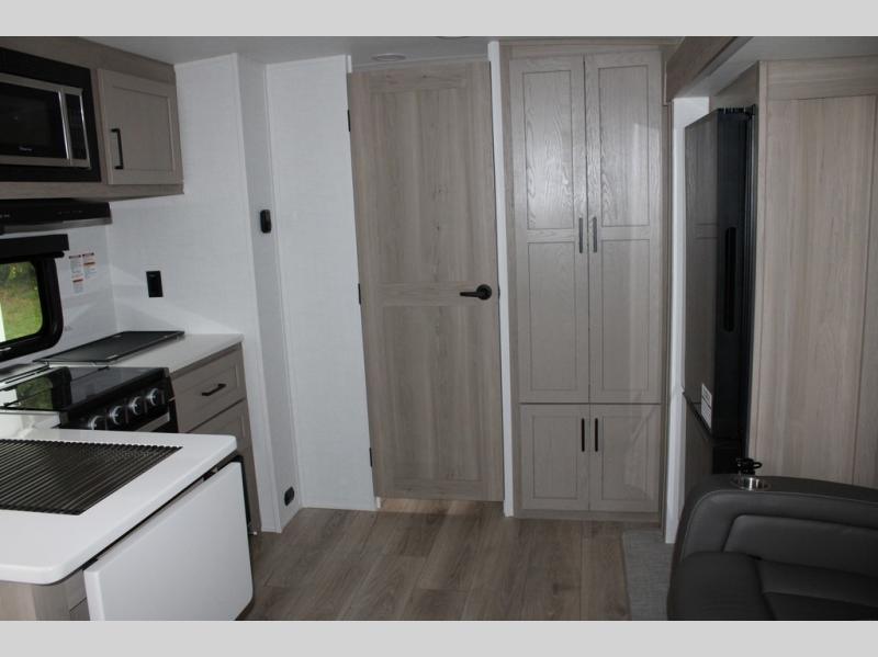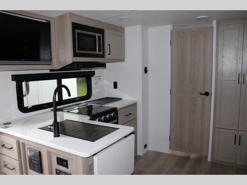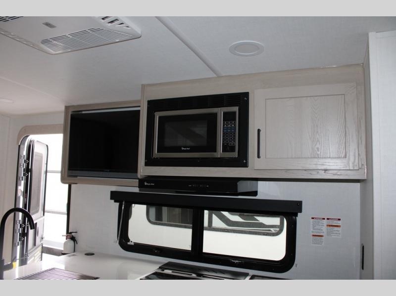 This excellent Flagstaff Micro Lite travel trailer has just what you want! There is a private bedroom with an RV queen bed and a wardrobe slide, and the kitchen provides you with a three-burner range, gas oven, double-bowl sink, and extra counter space. The 67" theater seating is perfectly placed across from the TV, and there are also two pantries so you can grab a snack before sitting down to relax. The rear bathroom is full of all of the essentials, and there is also an outdoor kitchen on this model so that you can stay outside even while you are preparing dinner.