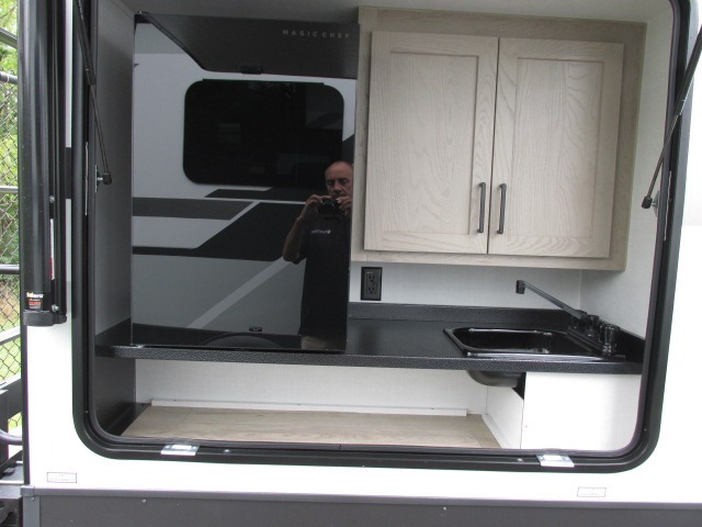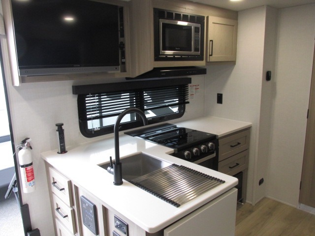 This excellent Flagstaff Micro Lite travel trailer has just what you want! There is a private bedroom with an RV queen bed and a wardrobe slide, and the kitchen provides you with a three-burner range, gas oven, double-bowl sink, and extra counter space. The 67" theater seating is perfectly placed across from the TV, and there are also two pantries so you can grab a snack before sitting down to relax. The rear bathroom is full of all of the essentials, and there is also an outdoor kitchen on this model so that you can stay outside even while you are preparing dinner.