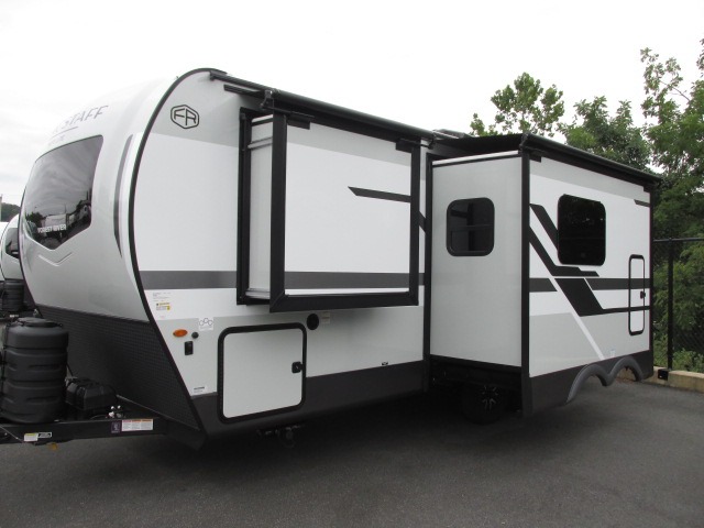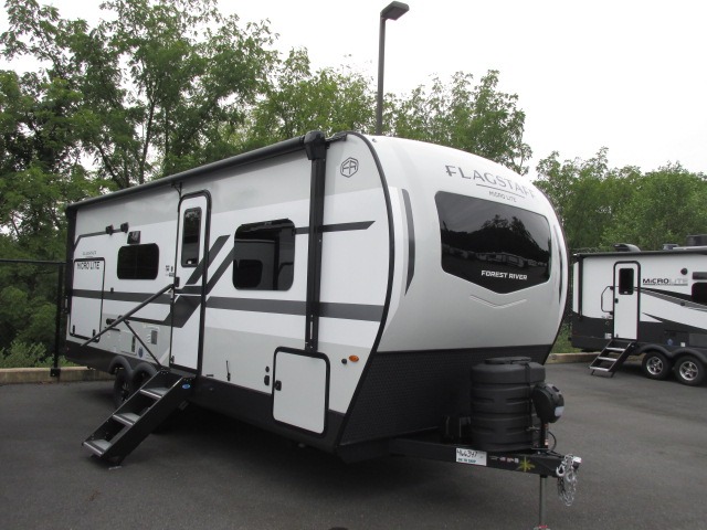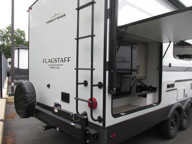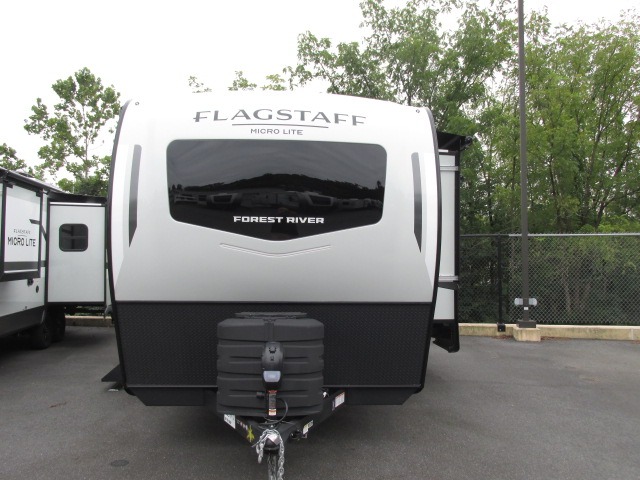 With any Flagstaff Micro Lite travel trailer by Forest River you will enjoy lightweight towing, durable construction, and added interior comforts to make each trip memorable! Each model features RoadTech tire pressure monitoring, Dexter Torflex axles, and nitrogen-filled Goodyear endurance tires for smooth towing from home to campground. The 6-sided aluminum framed construction provides a strong foundation so you can enjoy your RV for years to come, plus the radiant foil in the front cap, underbelly and slides help insulate your trailer. Additional exterior features include a 200W solar panel, back-up camera prep, frameless windows, and slam baggage doors. Each model includes the Great Expectations Package with roller shades, solid surface kitchen countertops, and hidden hinge cabinet doors. There is also an exterior hot/cold water port, outside speakers, a power tongue jack and stabilizer jacks, plus many more conveniences.