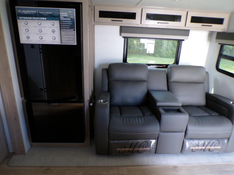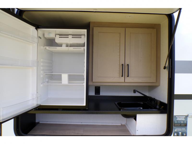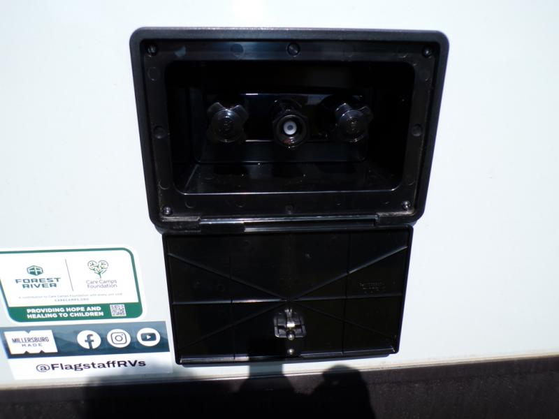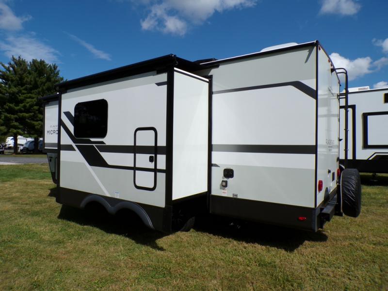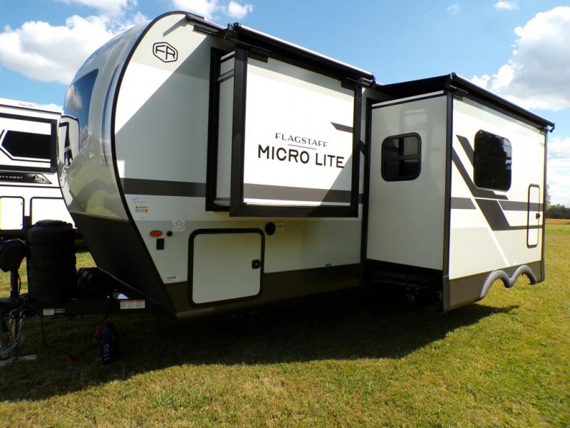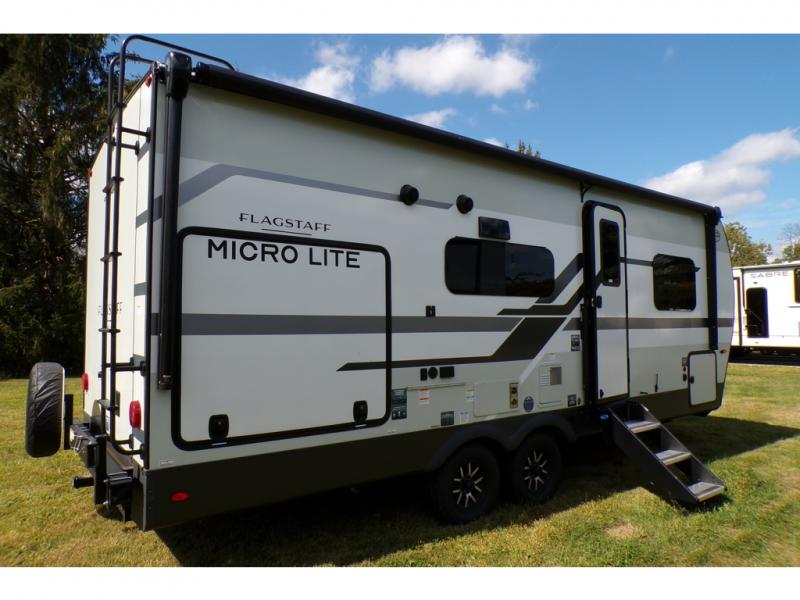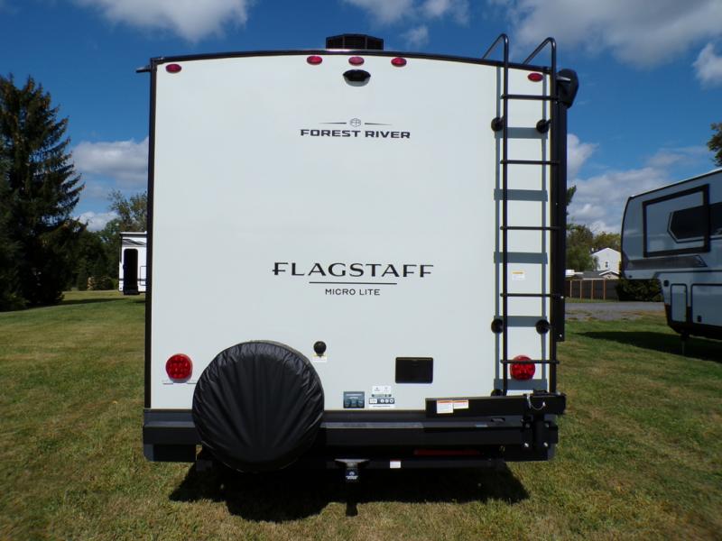 With any Flagstaff Micro Lite travel trailer by Forest River you will enjoy lightweight towing, durable construction, and added interior comforts to make each trip memorable! Each model features RoadTech tire pressure monitoring, Dexter Torflex axles, and nitrogen-filled Goodyear endurance tires for smooth towing from home to campground. The 6-sided aluminum framed construction provides a strong foundation so you can enjoy your RV for years to come, plus the radiant foil in the front cap, underbelly and slides help insulate your trailer. Additional exterior features include a 200W solar panel, back-up camera prep, frameless windows, and slam baggage doors. Each model includes the Great Expectations Package with roller shades, solid surface kitchen countertops, and hidden hinge cabinet doors. There is also an exterior hot/cold water port, outside speakers, a power tongue jack and stabilizer jacks, plus many more conveniences.