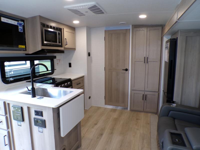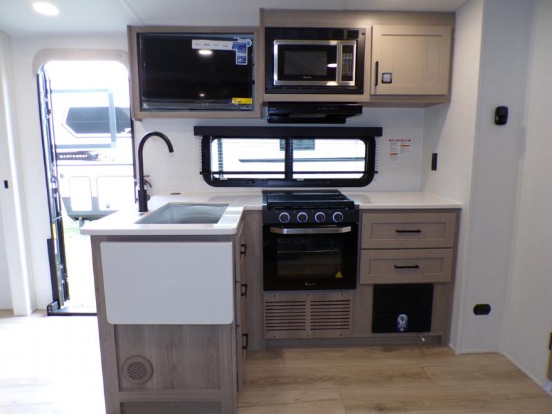This excellent Flagstaff Micro Lite travel trailer has just what you want! There is a private bedroom with an RV queen bed and a wardrobe slide, and the kitchen provides you with a three-burner range, gas oven, double-bowl sink, and extra counter space. The 67" theater seating is perfectly placed across from the TV, and there are also two pantries so you can grab a snack before sitting down to relax. The rear bathroom is full of all of the essentials, and there is also an outdoor kitchen on this model so that you can stay outside even while you are preparing dinner.