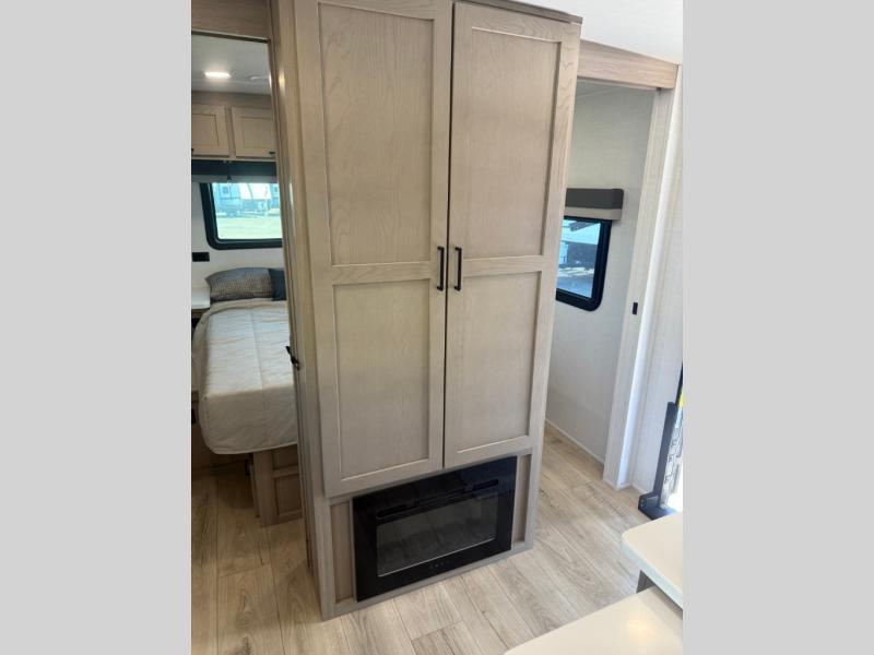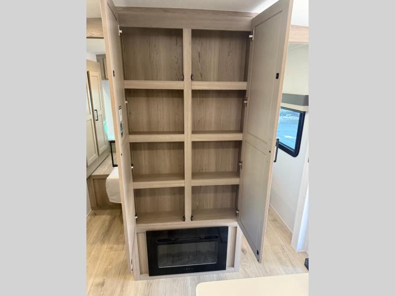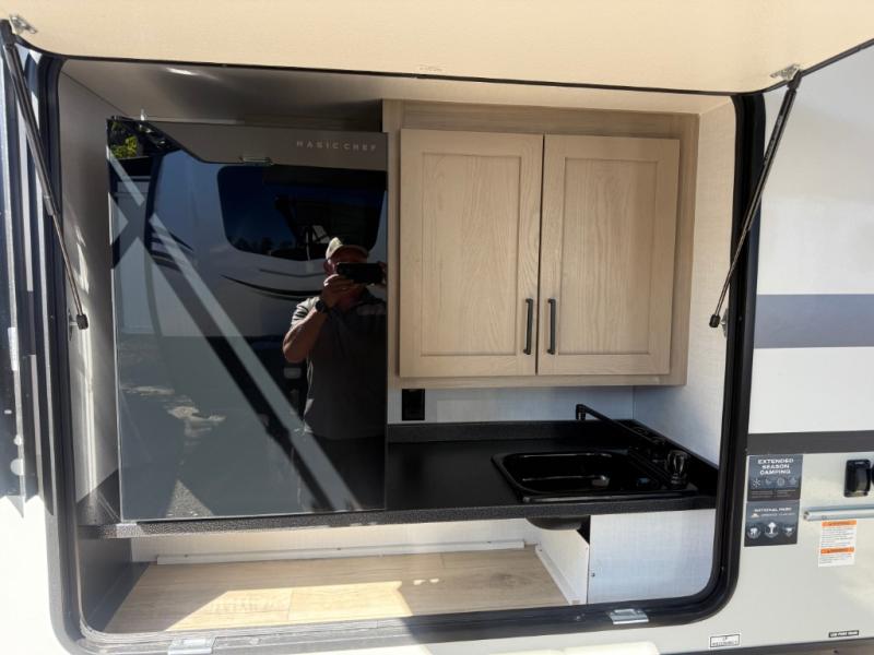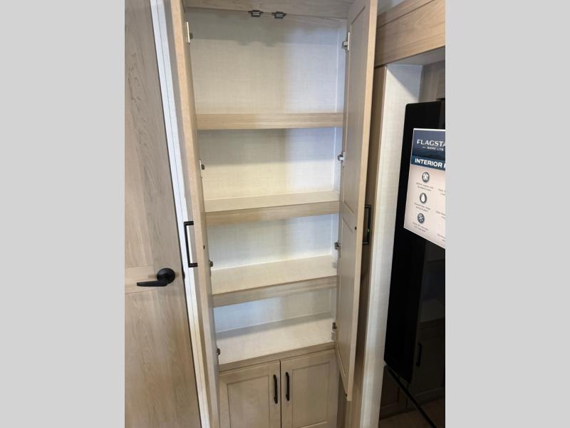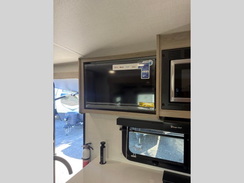 This excellent Flagstaff Micro Lite travel trailer has just what you want! There is a private bedroom with an RV queen bed and a wardrobe slide, and the kitchen provides you with a three-burner range, gas oven, double-bowl sink, and extra counter space. The 67" theater seating is perfectly placed across from the TV, and there are also two pantries so you can grab a snack before sitting down to relax. The rear bathroom is full of all of the essentials, and there is also an outdoor kitchen on this model so that you can stay outside even while you are preparing dinner.