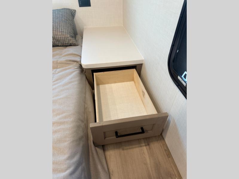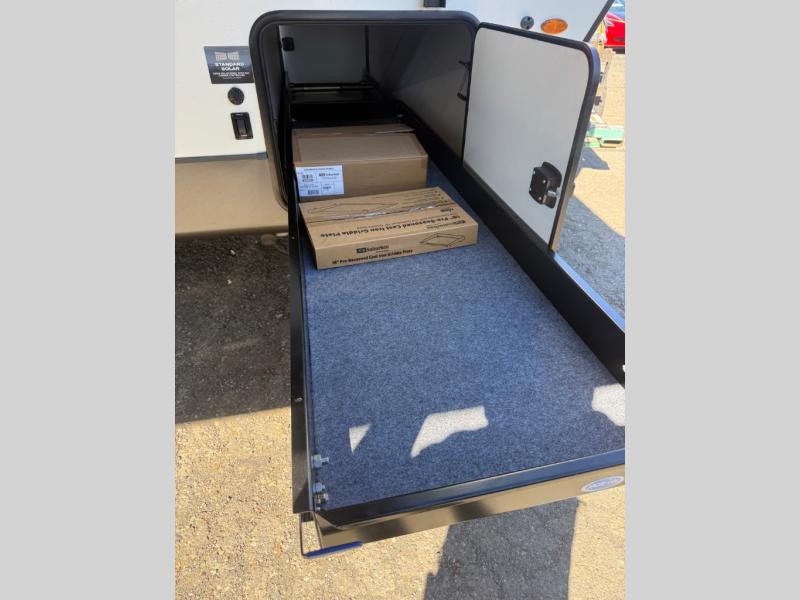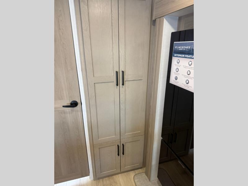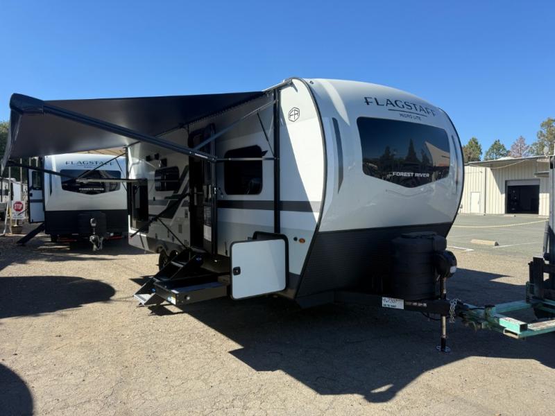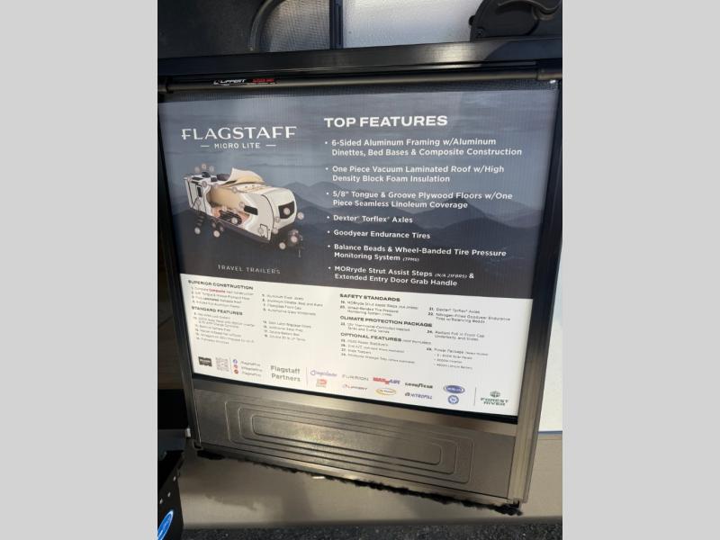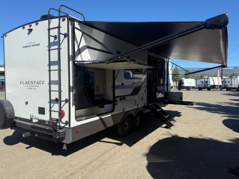 With any Flagstaff Micro Lite travel trailer by Forest River you will enjoy lightweight towing, durable construction, and added interior comforts to make each trip memorable! Each model features RoadTech tire pressure monitoring, Dexter Torflex axles, and nitrogen-filled Goodyear endurance tires for smooth towing from home to campground. The 6-sided aluminum framed construction provides a strong foundation so you can enjoy your RV for years to come, plus the radiant foil in the front cap, underbelly and slides help insulate your trailer. Additional exterior features include a 200W solar panel, back-up camera prep, frameless windows, and slam baggage doors. Each model includes the Great Expectations Package with roller shades, solid surface kitchen countertops, and hidden hinge cabinet doors. There is also an exterior hot/cold water port, outside speakers, a power tongue jack and stabilizer jacks, plus many more conveniences.