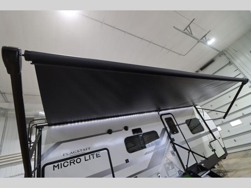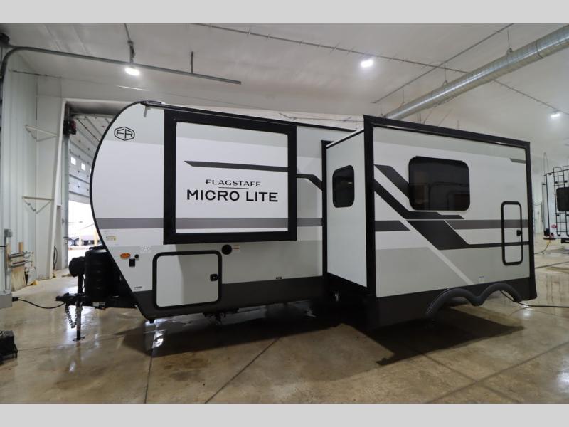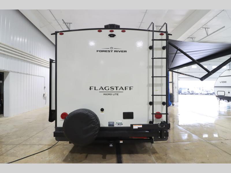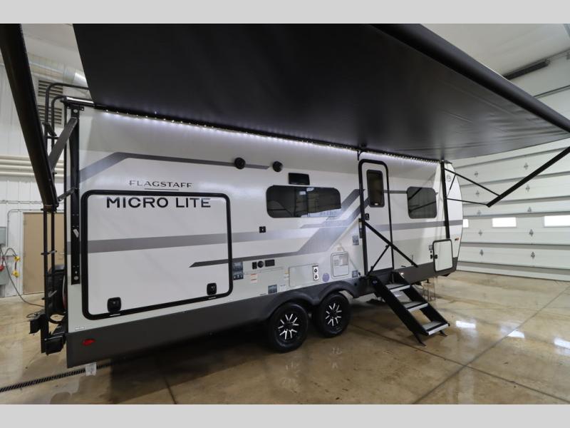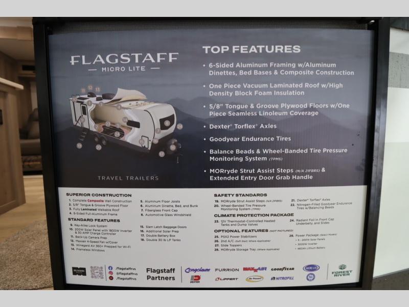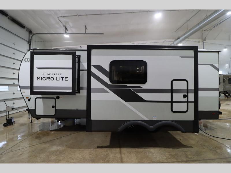 With any Flagstaff Micro Lite travel trailer by Forest River you will enjoy lightweight towing, durable construction, and added interior comforts to make each trip memorable! Each model features RoadTech tire pressure monitoring, Dexter Torflex axles, and nitrogen-filled Goodyear endurance tires for smooth towing from home to campground. The 6-sided aluminum framed construction provides a strong foundation so you can enjoy your RV for years to come, plus the radiant foil in the front cap, underbelly and slides help insulate your trailer. Additional exterior features include a 200W solar panel, back-up camera prep, frameless windows, and slam baggage doors. Each model includes the Great Expectations Package with roller shades, solid surface kitchen countertops, and hidden hinge cabinet doors. There is also an exterior hot/cold water port, outside speakers, a power tongue jack and stabilizer jacks, plus many more conveniences.