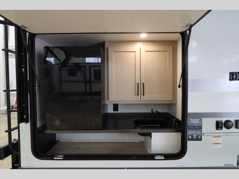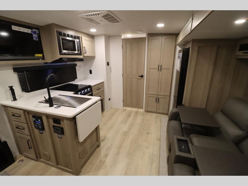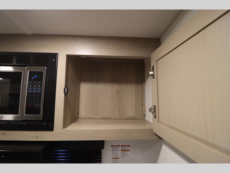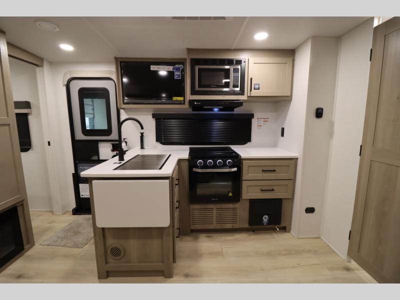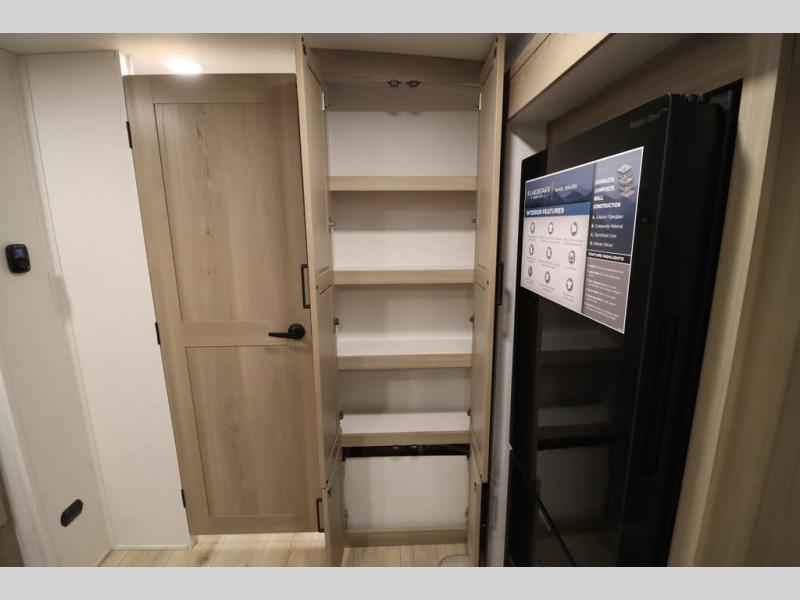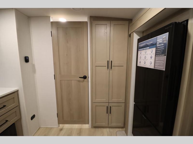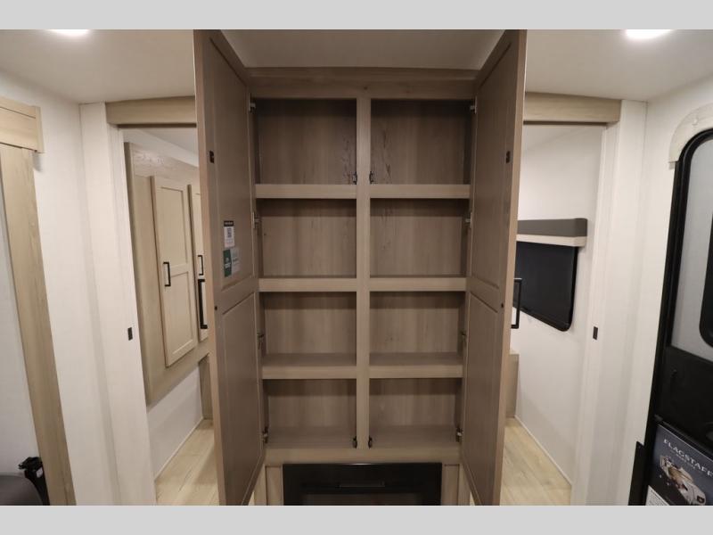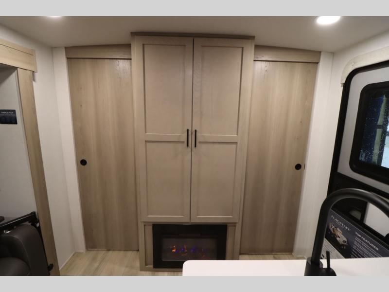 This excellent Flagstaff Micro Lite travel trailer has just what you want! There is a private bedroom with an RV queen bed and a wardrobe slide, and the kitchen provides you with a three-burner range, gas oven, double-bowl sink, and extra counter space. The 67" theater seating is perfectly placed across from the TV, and there are also two pantries so you can grab a snack before sitting down to relax. The rear bathroom is full of all of the essentials, and there is also an outdoor kitchen on this model so that you can stay outside even while you are preparing dinner.