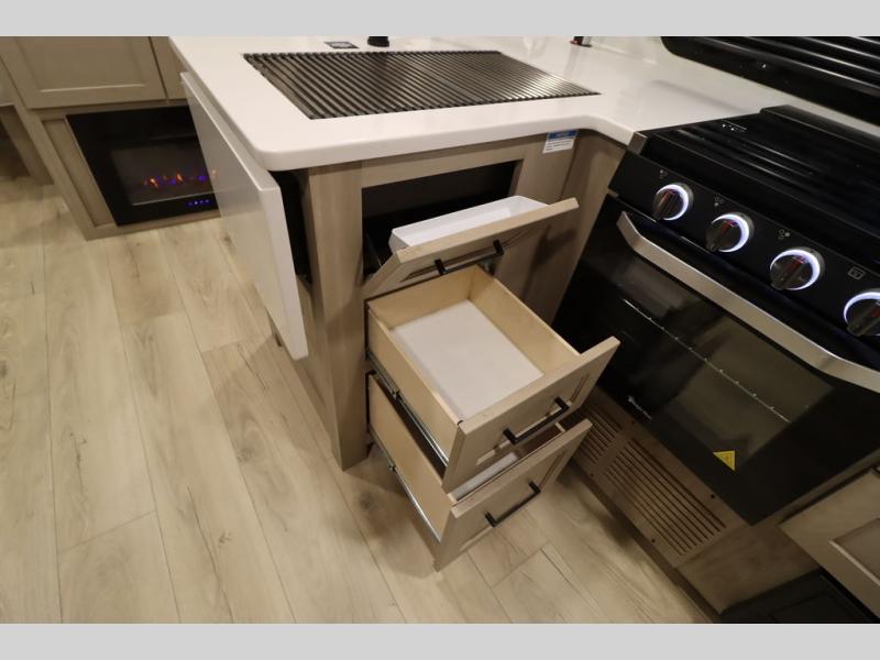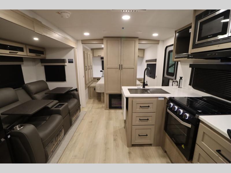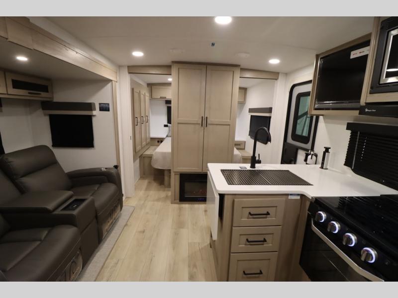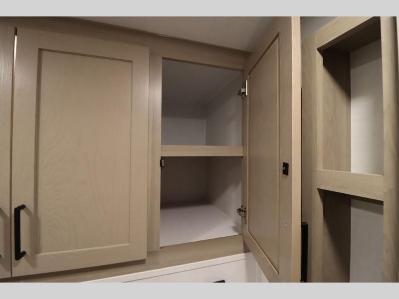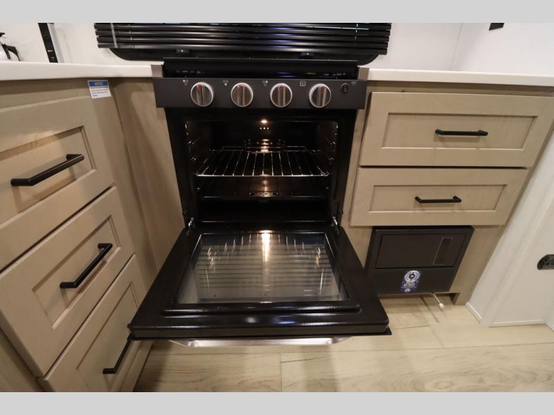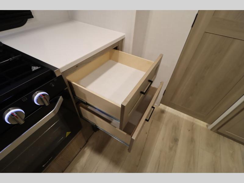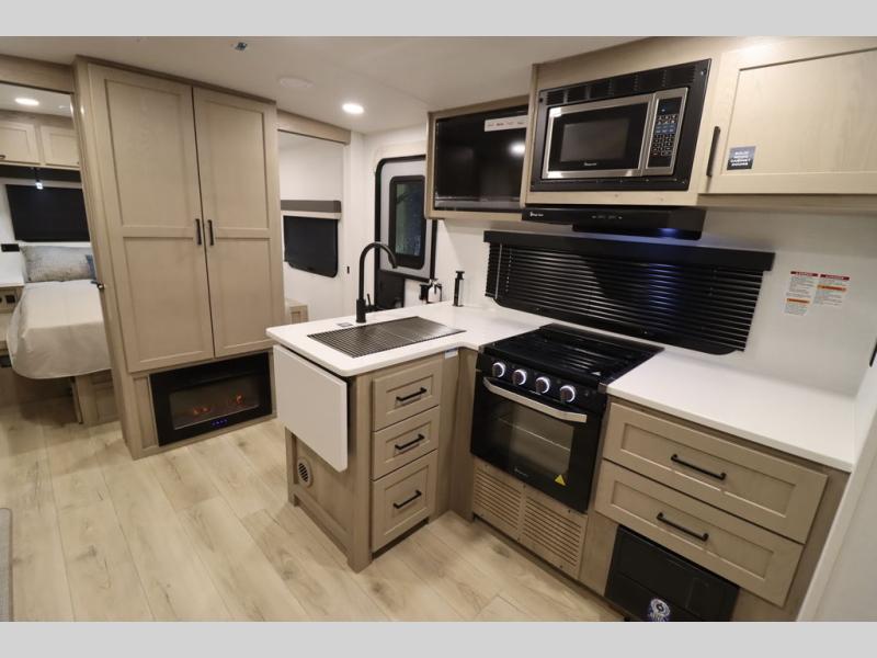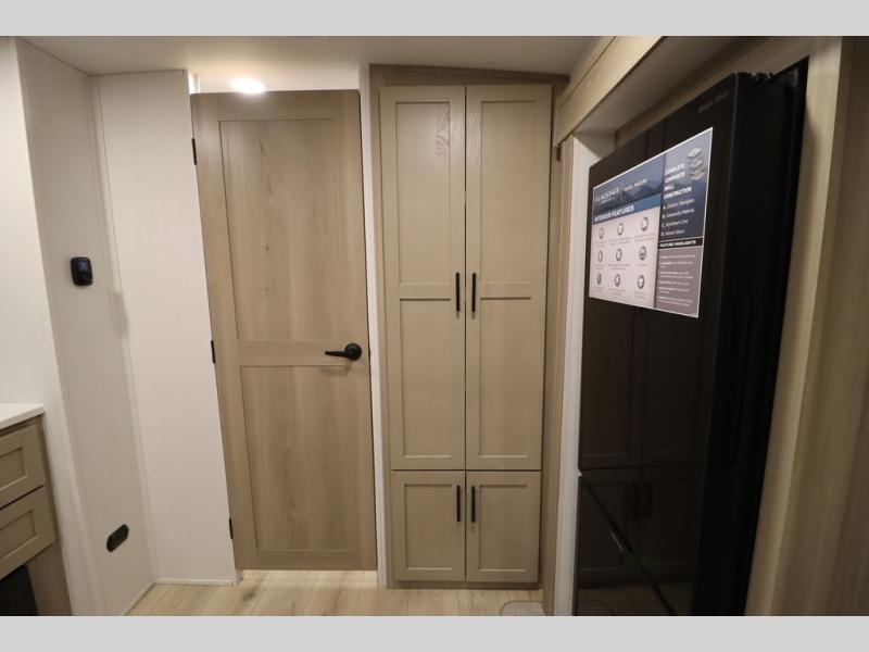 This excellent Flagstaff Micro Lite travel trailer has just what you want! There is a private bedroom with an RV queen bed and a wardrobe slide, and the kitchen provides you with a three-burner range, gas oven, double-bowl sink, and extra counter space. The 67" theater seating is perfectly placed across from the TV, and there are also two pantries so you can grab a snack before sitting down to relax. The rear bathroom is full of all of the essentials, and there is also an outdoor kitchen on this model so that you can stay outside even while you are preparing dinner.