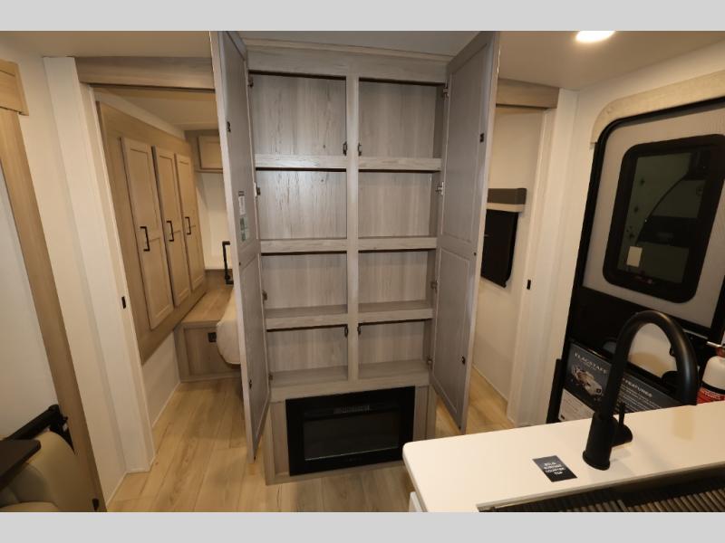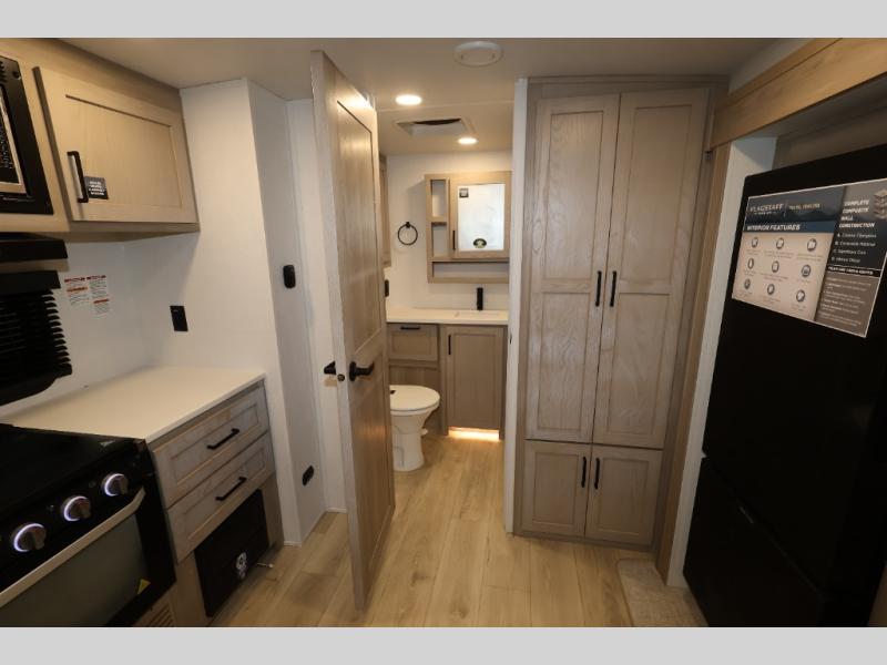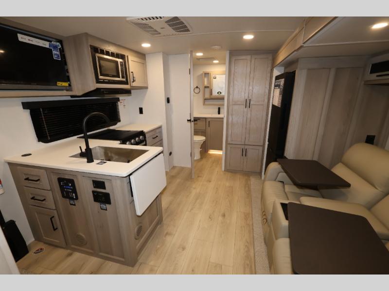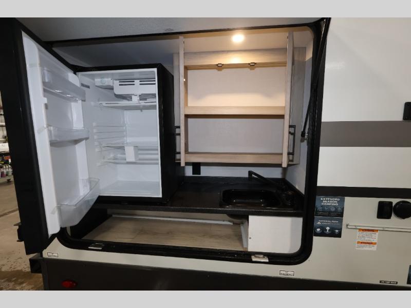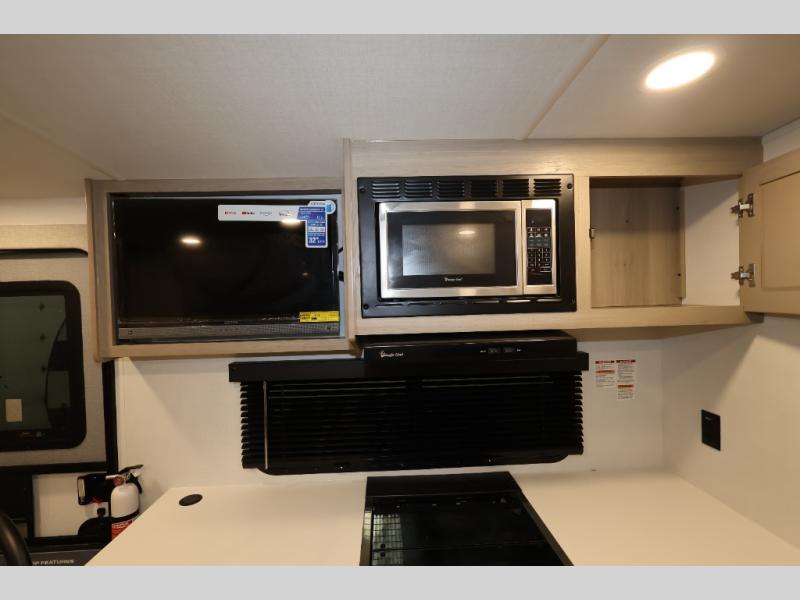 This excellent Flagstaff Micro Lite travel trailer has just what you want! There is a private bedroom with an RV queen bed and a wardrobe slide, and the kitchen provides you with a three-burner range, gas oven, double-bowl sink, and extra counter space. The 67" theater seating is perfectly placed across from the TV, and there are also two pantries so you can grab a snack before sitting down to relax. The rear bathroom is full of all of the essentials, and there is also an outdoor kitchen on this model so that you can stay outside even while you are preparing dinner.