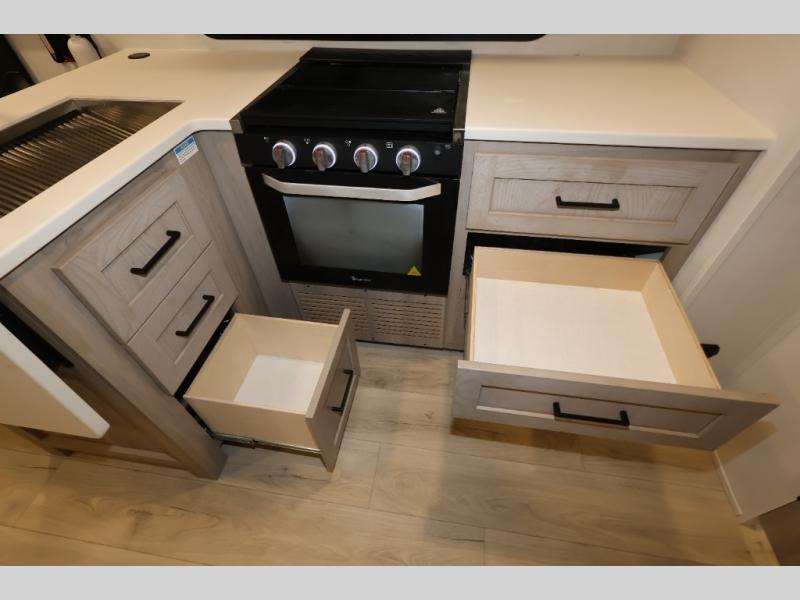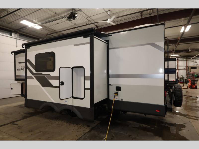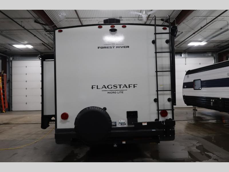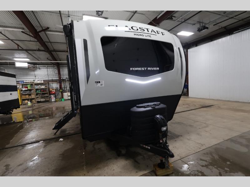 With any Flagstaff Micro Lite travel trailer by Forest River you will enjoy lightweight towing, durable construction, and added interior comforts to make each trip memorable! Each model features RoadTech tire pressure monitoring, Dexter Torflex axles, and nitrogen-filled Goodyear endurance tires for smooth towing from home to campground. The 6-sided aluminum framed construction provides a strong foundation so you can enjoy your RV for years to come, plus the radiant foil in the front cap, underbelly and slides help insulate your trailer. Additional exterior features include a 200W solar panel, back-up camera prep, frameless windows, and slam baggage doors. Each model includes the Great Expectations Package with roller shades, solid surface kitchen countertops, and hidden hinge cabinet doors. There is also an exterior hot/cold water port, outside speakers, a power tongue jack and stabilizer jacks, plus many more conveniences.