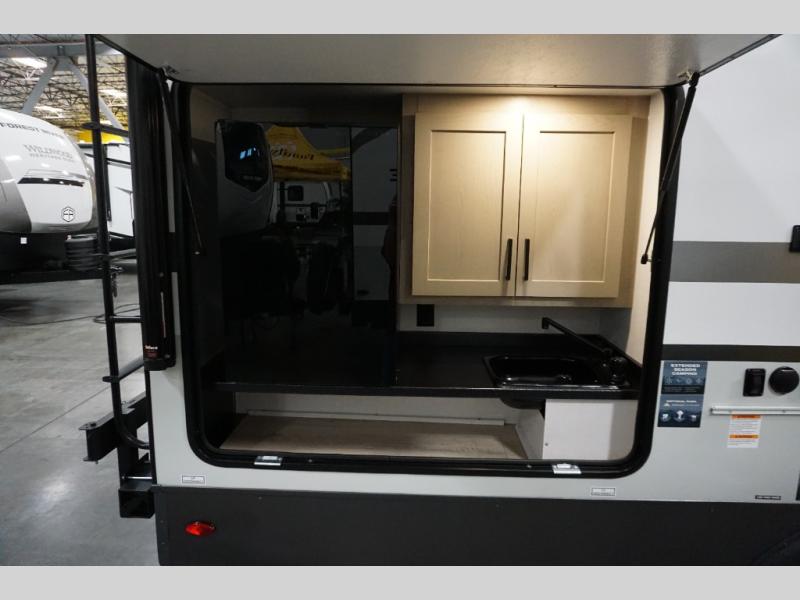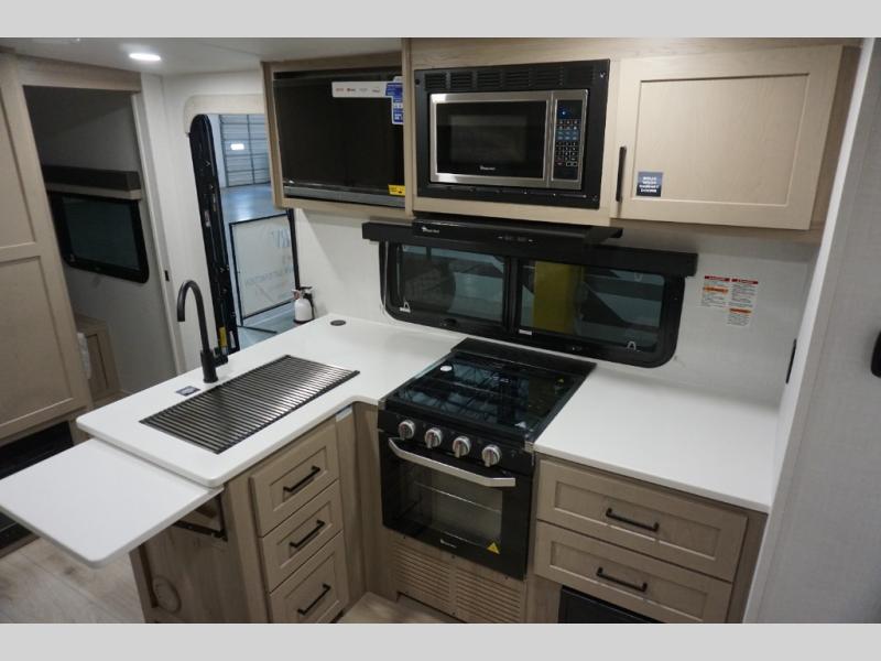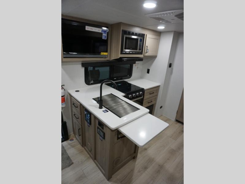 This excellent Flagstaff Micro Lite travel trailer has just what you want! There is a private bedroom with an RV queen bed and a wardrobe slide, and the kitchen provides you with a three-burner range, gas oven, double-bowl sink, and extra counter space. The 67" theater seating is perfectly placed across from the TV, and there are also two pantries so you can grab a snack before sitting down to relax. The rear bathroom is full of all of the essentials, and there is also an outdoor kitchen on this model so that you can stay outside even while you are preparing dinner.