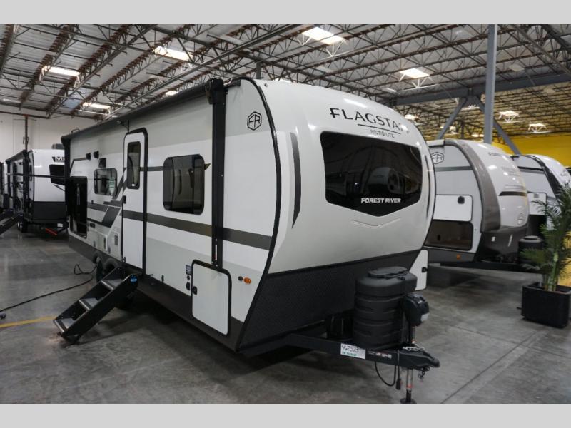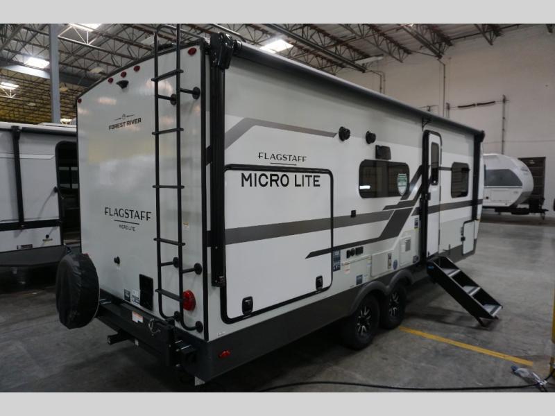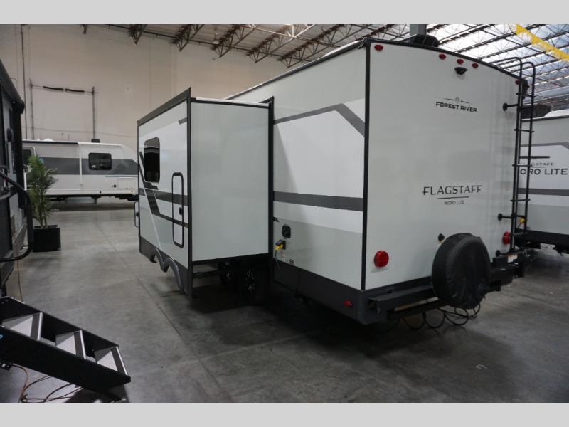 With any Flagstaff Micro Lite travel trailer by Forest River you will enjoy lightweight towing, durable construction, and added interior comforts to make each trip memorable! Each model features RoadTech tire pressure monitoring, Dexter Torflex axles, and nitrogen-filled Goodyear endurance tires for smooth towing from home to campground. The 6-sided aluminum framed construction provides a strong foundation so you can enjoy your RV for years to come, plus the radiant foil in the front cap, underbelly and slides help insulate your trailer. Additional exterior features include a 200W solar panel, back-up camera prep, frameless windows, and slam baggage doors. Each model includes the Great Expectations Package with roller shades, solid surface kitchen countertops, and hidden hinge cabinet doors. There is also an exterior hot/cold water port, outside speakers, a power tongue jack and stabilizer jacks, plus many more conveniences.