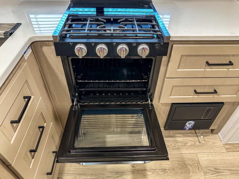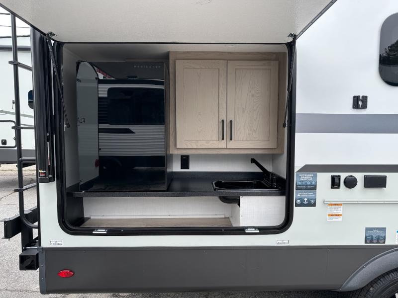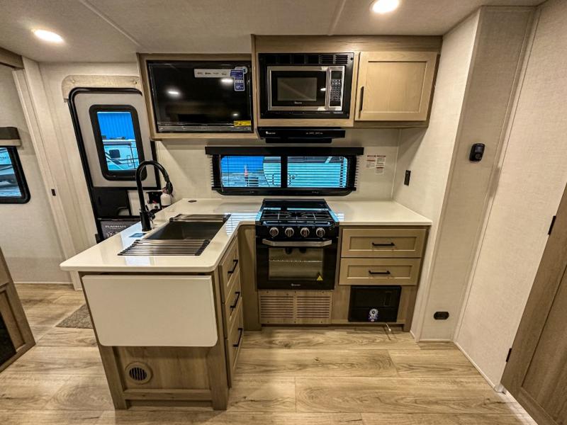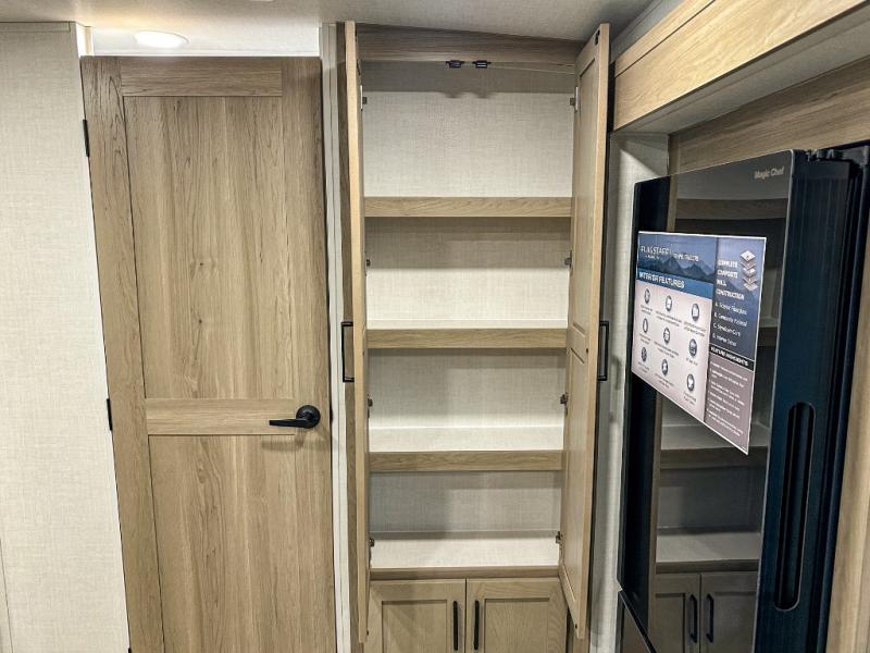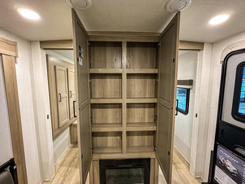 This excellent Flagstaff Micro Lite travel trailer has just what you want! There is a private bedroom with an RV queen bed and a wardrobe slide, and the kitchen provides you with a three-burner range, gas oven, double-bowl sink, and extra counter space. The 67" theater seating is perfectly placed across from the TV, and there are also two pantries so you can grab a snack before sitting down to relax. The rear bathroom is full of all of the essentials, and there is also an outdoor kitchen on this model so that you can stay outside even while you are preparing dinner.