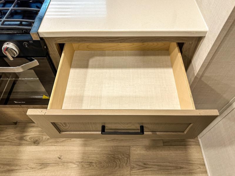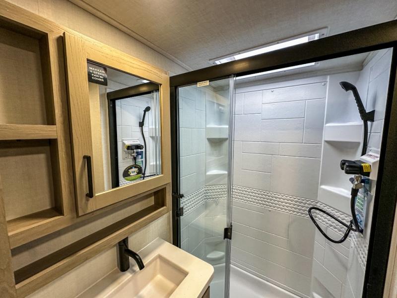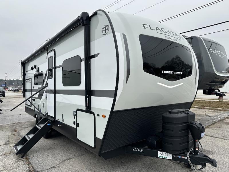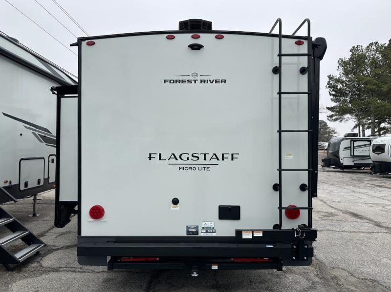 With any Flagstaff Micro Lite travel trailer by Forest River you will enjoy lightweight towing, durable construction, and added interior comforts to make each trip memorable! Each model features RoadTech tire pressure monitoring, Dexter Torflex axles, and nitrogen-filled Goodyear endurance tires for smooth towing from home to campground. The 6-sided aluminum framed construction provides a strong foundation so you can enjoy your RV for years to come, plus the radiant foil in the front cap, underbelly and slides help insulate your trailer. Additional exterior features include a 200W solar panel, back-up camera prep, frameless windows, and slam baggage doors. Each model includes the Great Expectations Package with roller shades, solid surface kitchen countertops, and hidden hinge cabinet doors. There is also an exterior hot/cold water port, outside speakers, a power tongue jack and stabilizer jacks, plus many more conveniences.