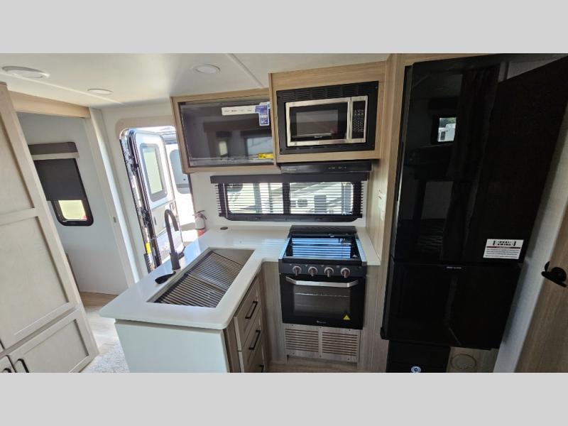 Camping in this single slide out travel trailer will make weekends at the campground comfy and hassle-free! Once you arrive, you can unload the pass-through storage, put out the 18' power awning, then make lunch on the exterior griddle. There is also a full interior kitchen to make meals when the weather isn't cooperating. Everyone can gather around the U-shaped dinette slide for meal times or game night, and there is a spacious pantry where you can store snacks! The bunk beds include a flip-up bottom bunk and an exterior bike door so you can easily pack camp gear away, and the full bath is right next to the bunks for easy nighttime use. Head up front to enjoy your own private bedroom with an RV queen bed, dual wardrobes, and flip-up storage!