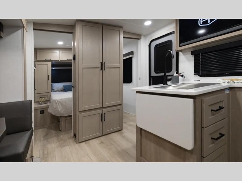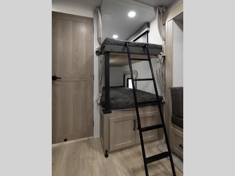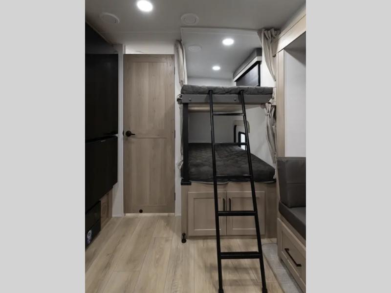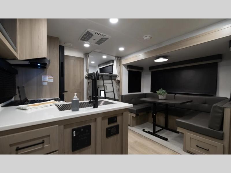 Camping in this single slide out travel trailer will make weekends at the campground comfy and hassle-free! Once you arrive, you can unload the pass-through storage, put out the 18' power awning, then relax in your camp chairs. And there is a full interior kitchen to make meals when you get hungry. Everyone can gather around the U-shaped dinette slide for meal times or game night, and there is a spacious pantry where you can store snacks! The bunk beds include a flip-up bottom bunk and an exterior bike door so you can easily pack camp gear away, and the full bath is right next to the bunks for easy nighttime use. Head up front to enjoy your own private bedroom with an RV queen bed, dual wardrobes, and flip-up storage!