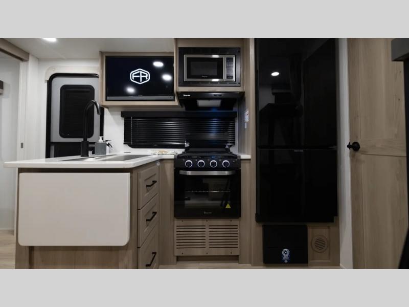 With any Flagstaff Micro Lite travel trailer by Forest River you will enjoy lightweight towing, durable construction, and added interior comforts to make each trip memorable! Each model features RoadTech tire pressure monitoring, Dexter Torflex axles, and nitrogen-filled Goodyear endurance tires for smooth towing from home to campground. The 6-sided aluminum framed construction provides a strong foundation so you can enjoy your RV for years to come, plus the radiant foil in the front cap, underbelly and slides help insulate your trailer. Additional exterior features include a 200W solar panel, back-up camera prep, frameless windows, and slam baggage doors. Each model includes the Great Expectations Package with roller shades, solid surface kitchen countertops, and hidden hinge cabinet doors. There is also an exterior hot/cold water port, outside speakers, a power tongue jack and stabilizer jacks, plus many more conveniences.