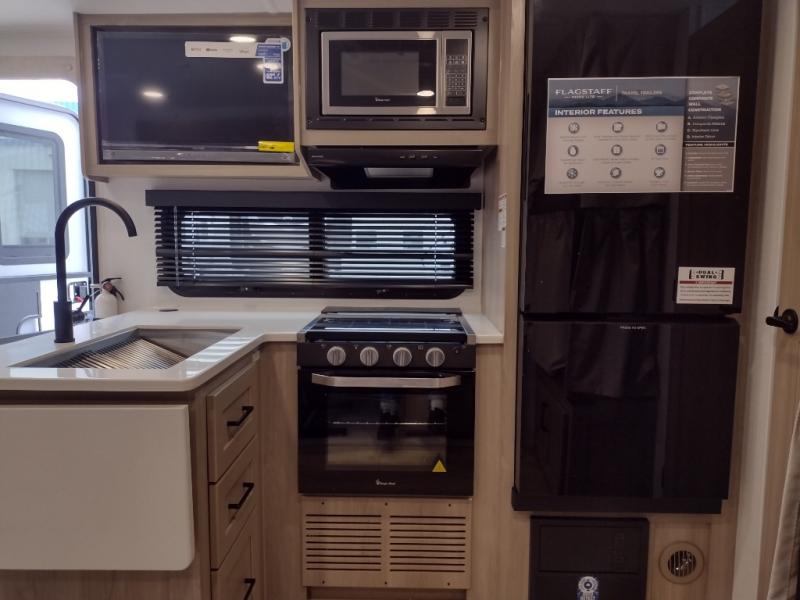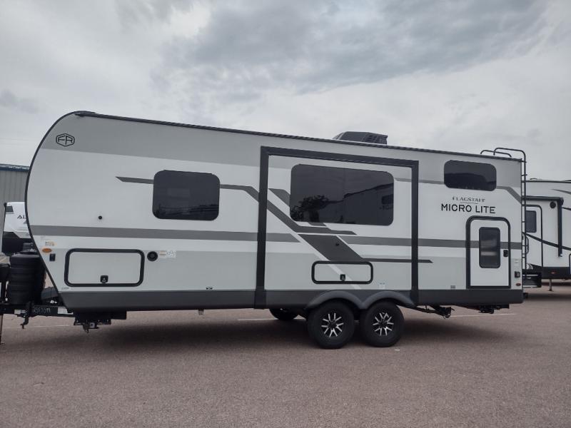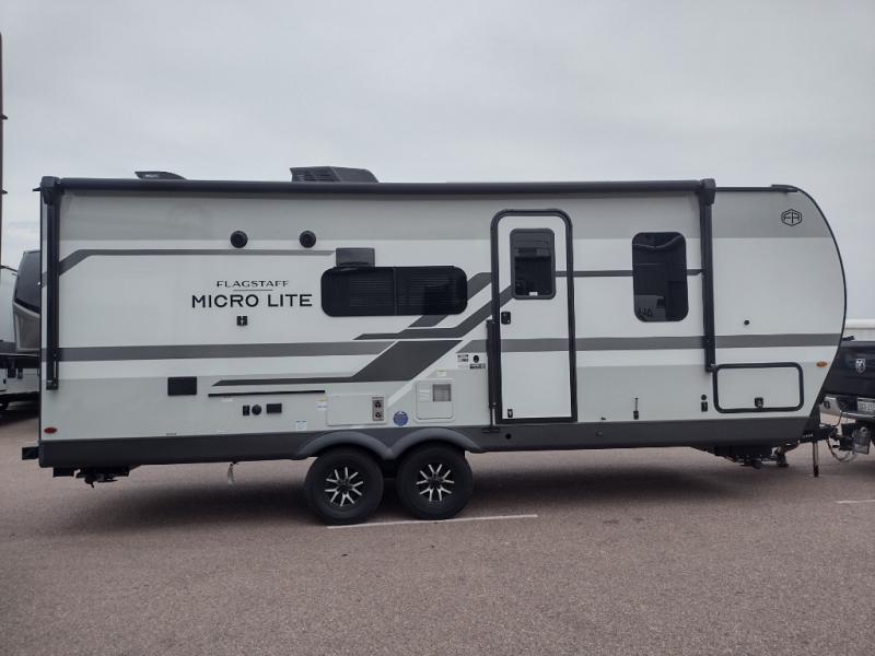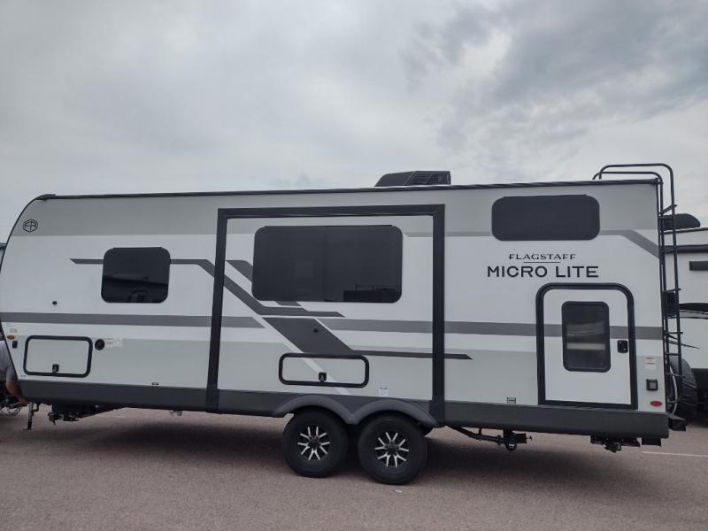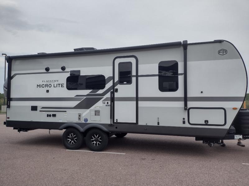 With any Flagstaff Micro Lite travel trailer by Forest River you will enjoy lightweight towing, durable construction, and added interior comforts to make each trip memorable! Each model features RoadTech tire pressure monitoring, Dexter Torflex axles, and nitrogen-filled Goodyear endurance tires for smooth towing from home to campground. The 6-sided aluminum framed construction provides a strong foundation so you can enjoy your RV for years to come, plus the radiant foil in the front cap, underbelly and slides help insulate your trailer. Additional exterior features include a 200W solar panel, back-up camera prep, frameless windows, and slam baggage doors. Each model includes the Great Expectations Package with roller shades, solid surface kitchen countertops, and hidden hinge cabinet doors. There is also an exterior hot/cold water port, outside speakers, a power tongue jack and stabilizer jacks, plus many more conveniences.