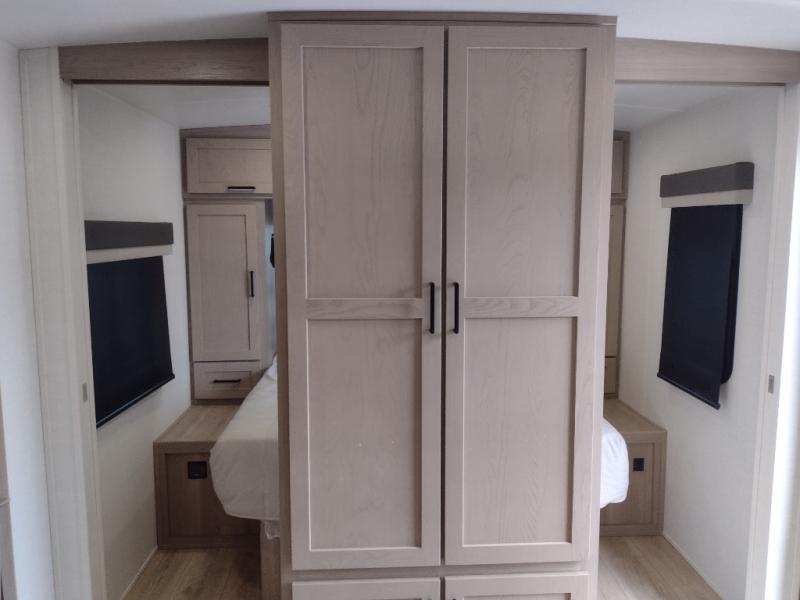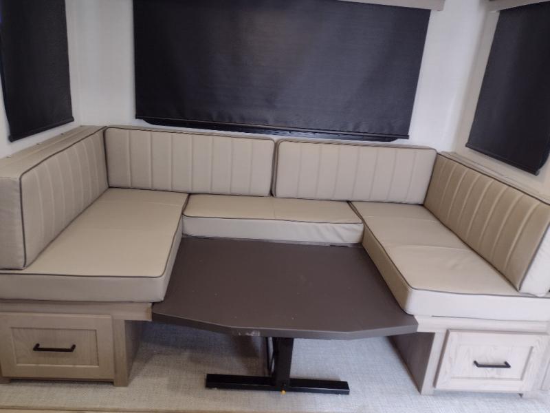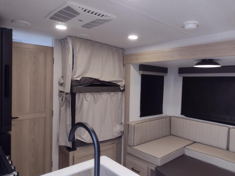 Camping in this single slide out travel trailer will make weekends at the campground comfy and hassle-free! Once you arrive, you can unload the pass-through storage, put out the 18' power awning, then relax in your camp chairs. And there is a full interior kitchen to make meals when you get hungry. Everyone can gather around the U-shaped dinette slide for meal times or game night, and there is a spacious pantry where you can store snacks! The bunk beds include a flip-up bottom bunk and an exterior bike door so you can easily pack camp gear away, and the full bath is right next to the bunks for easy nighttime use. Head up front to enjoy your own private bedroom with an RV queen bed, dual wardrobes, and flip-up storage!
