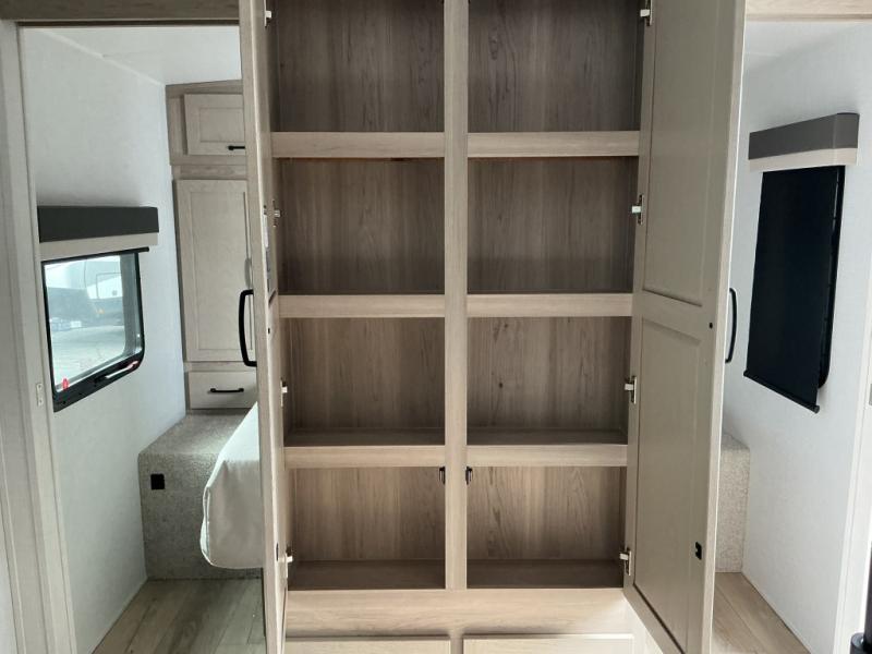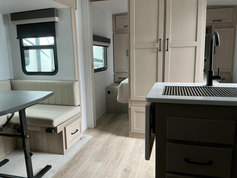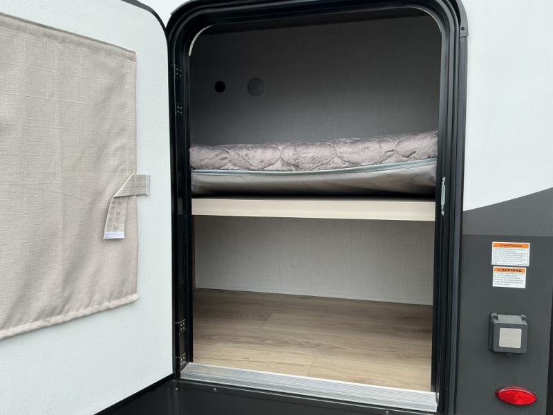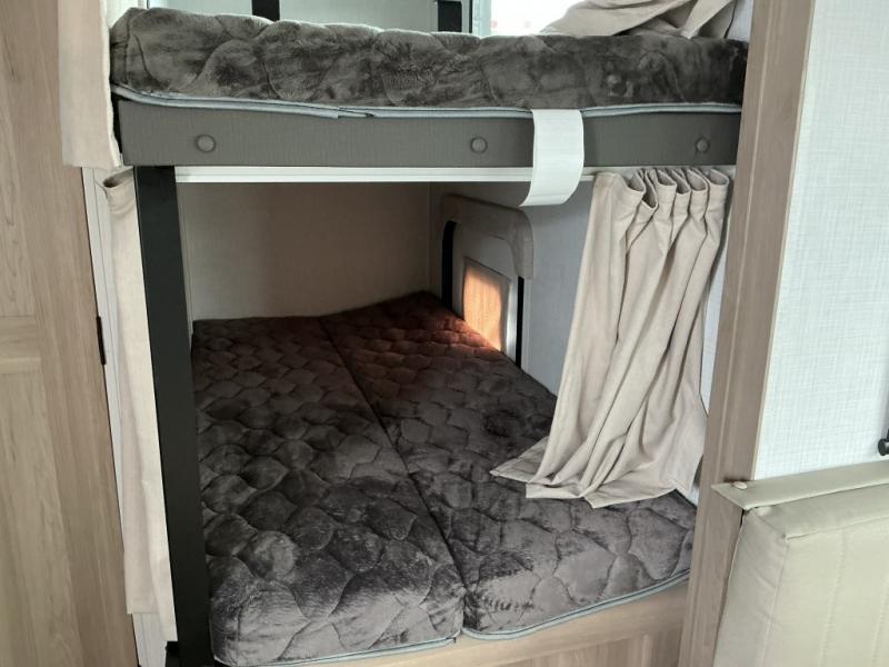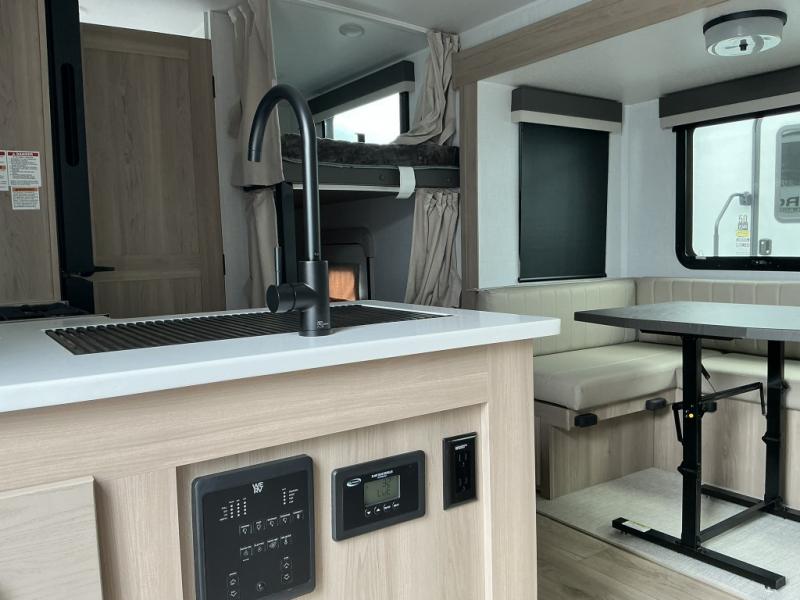 Camping in this single slide out travel trailer will make weekends at the campground comfy and hassle-free! Once you arrive, you can unload the pass-through storage, put out the 18' power awning, then relax in your camp chairs. And there is a full interior kitchen to make meals when you get hungry. Everyone can gather around the U-shaped dinette slide for meal times or game night, and there is a spacious pantry where you can store snacks! The bunk beds include a flip-up bottom bunk and an exterior bike door so you can easily pack camp gear away, and the full bath is right next to the bunks for easy nighttime use. Head up front to enjoy your own private bedroom with an RV queen bed, dual wardrobes, and flip-up storage!