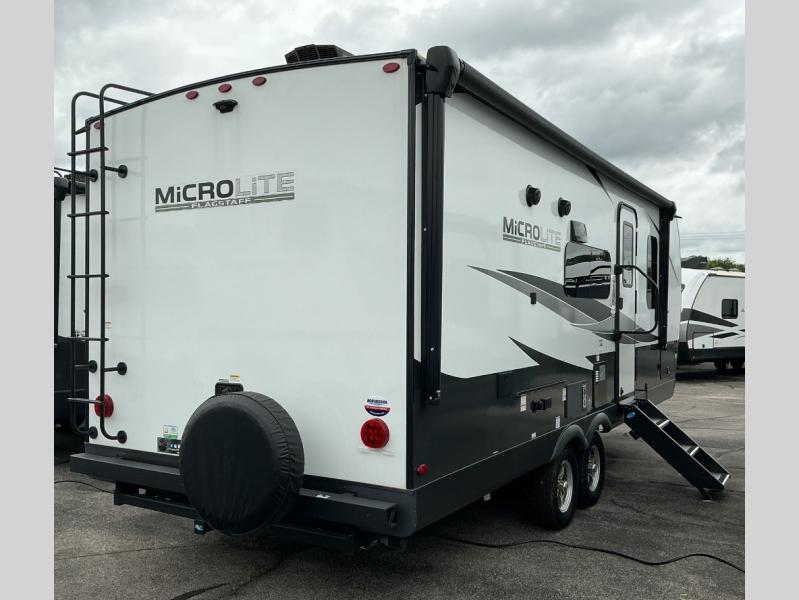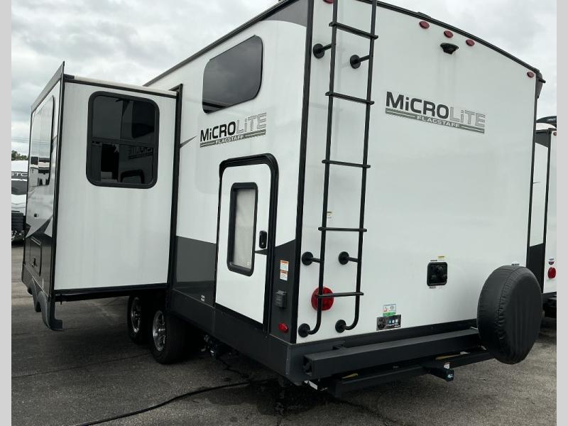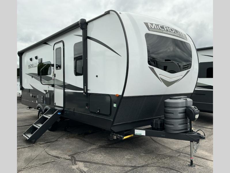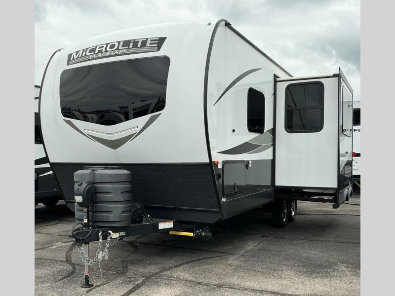 With any Flagstaff Micro Lite travel trailer by Forest River you will enjoy lightweight towing, durable construction, and added interior comforts to make each trip memorable! Each model features RoadTech tire pressure monitoring, Dexter Torflex axles, and nitrogen-filled Goodyear endurance tires for smooth towing from home to campground. The 6-sided aluminum framed construction provides a strong foundation so you can enjoy your RV for years to come, plus the radiant foil in the front cap, underbelly and slides help insulate your trailer. Additional exterior features include a 200W solar panel, back-up camera prep, frameless windows, and slam baggage doors. Each model includes the Great Expectations Package with roller shades, solid surface kitchen countertops, and hidden hinge cabinet doors. There is also an exterior hot/cold water port, outside speakers, a power tongue jack and stabilizer jacks, plus many more conveniences.