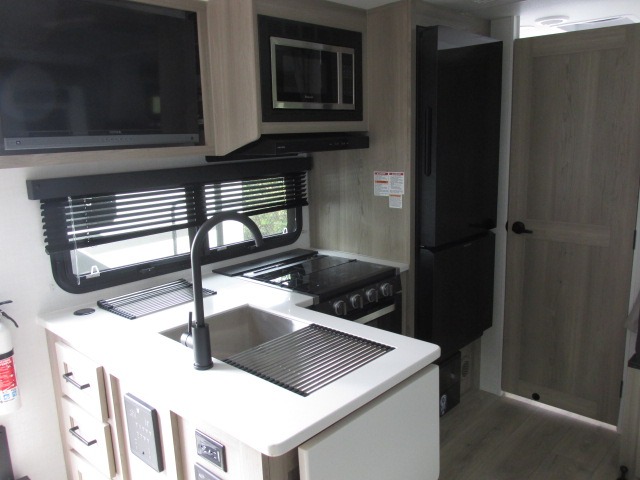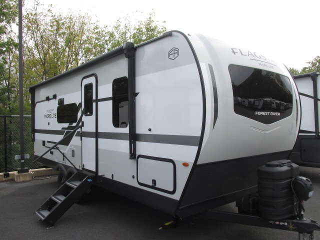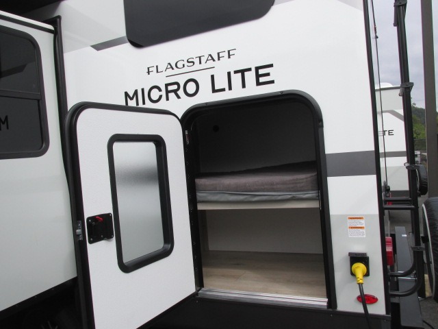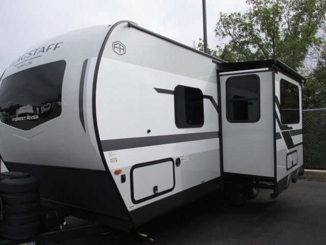 With any Flagstaff Micro Lite travel trailer by Forest River you will enjoy lightweight towing, durable construction, and added interior comforts to make each trip memorable! Each model features RoadTech tire pressure monitoring, Dexter Torflex axles, and nitrogen-filled Goodyear endurance tires for smooth towing from home to campground. The 6-sided aluminum framed construction provides a strong foundation so you can enjoy your RV for years to come, plus the radiant foil in the front cap, underbelly and slides help insulate your trailer. Additional exterior features include a 200W solar panel, back-up camera prep, frameless windows, and slam baggage doors. Each model includes the Great Expectations Package with roller shades, solid surface kitchen countertops, and hidden hinge cabinet doors. There is also an exterior hot/cold water port, outside speakers, a power tongue jack and stabilizer jacks, plus many more conveniences.