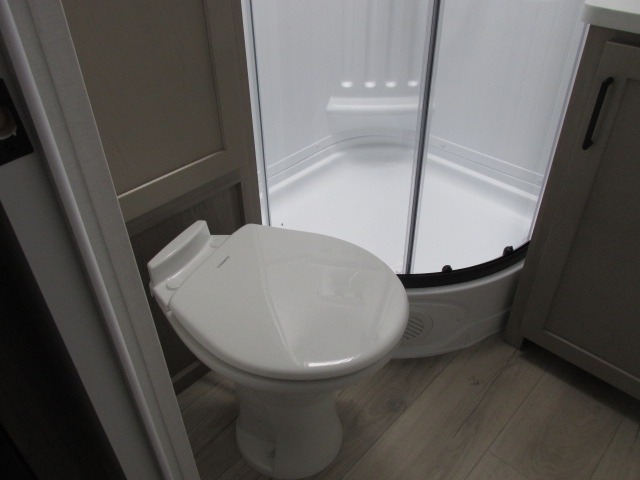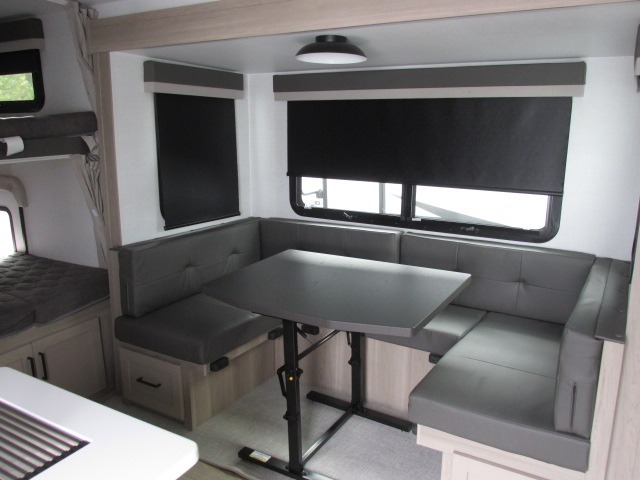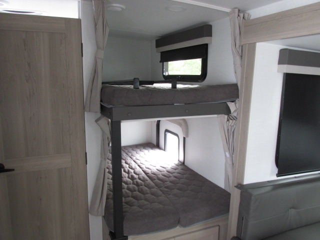 Camping in this single slide out travel trailer will make weekends at the campground comfy and hassle-free! Once you arrive, you can unload the pass-through storage, put out the 18' power awning, then relax in your camp chairs. And there is a full interior kitchen to make meals when you get hungry. Everyone can gather around the U-shaped dinette slide for meal times or game night, and there is a spacious pantry where you can store snacks! The bunk beds include a flip-up bottom bunk and an exterior bike door so you can easily pack camp gear away, and the full bath is right next to the bunks for easy nighttime use. Head up front to enjoy your own private bedroom with an RV queen bed, dual wardrobes, and flip-up storage!