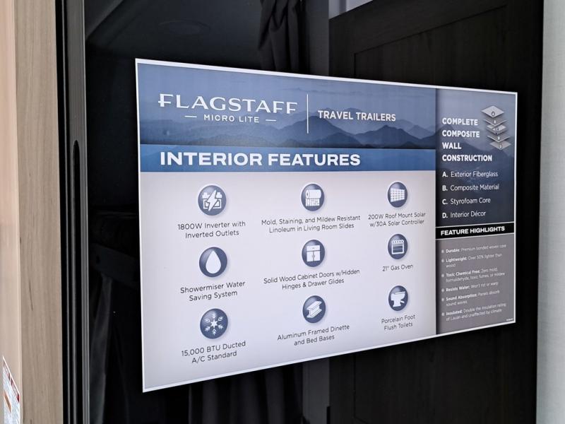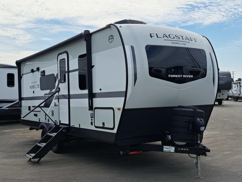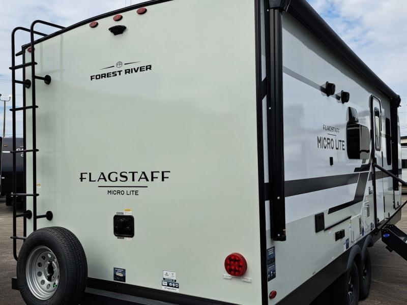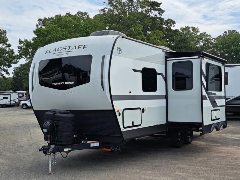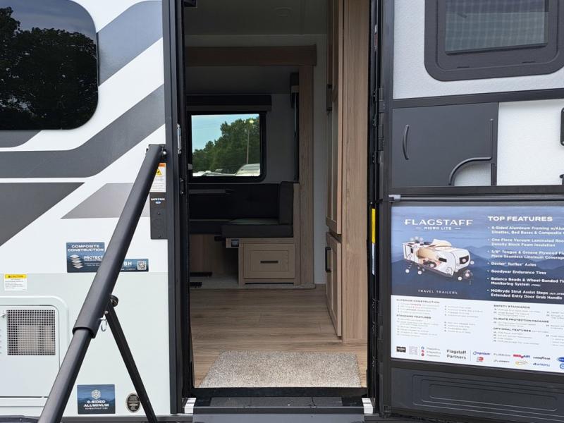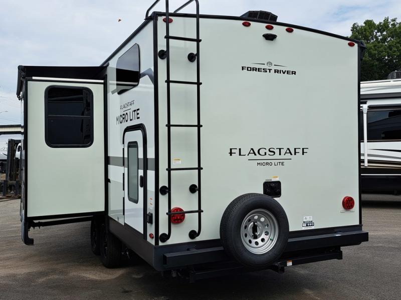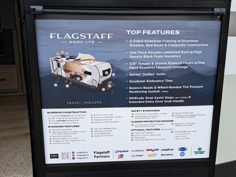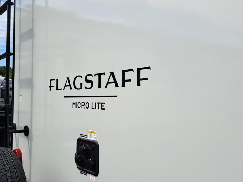 With any Flagstaff Micro Lite travel trailer by Forest River you will enjoy lightweight towing, durable construction, and added interior comforts to make each trip memorable! Each model features RoadTech tire pressure monitoring, Dexter Torflex axles, and nitrogen-filled Goodyear endurance tires for smooth towing from home to campground. The 6-sided aluminum framed construction provides a strong foundation so you can enjoy your RV for years to come, plus the radiant foil in the front cap, underbelly and slides help insulate your trailer. Additional exterior features include a 200W solar panel, back-up camera prep, frameless windows, and slam baggage doors. Each model includes the Great Expectations Package with roller shades, solid surface kitchen countertops, and hidden hinge cabinet doors. There is also an exterior hot/cold water port, outside speakers, a power tongue jack and stabilizer jacks, plus many more conveniences.