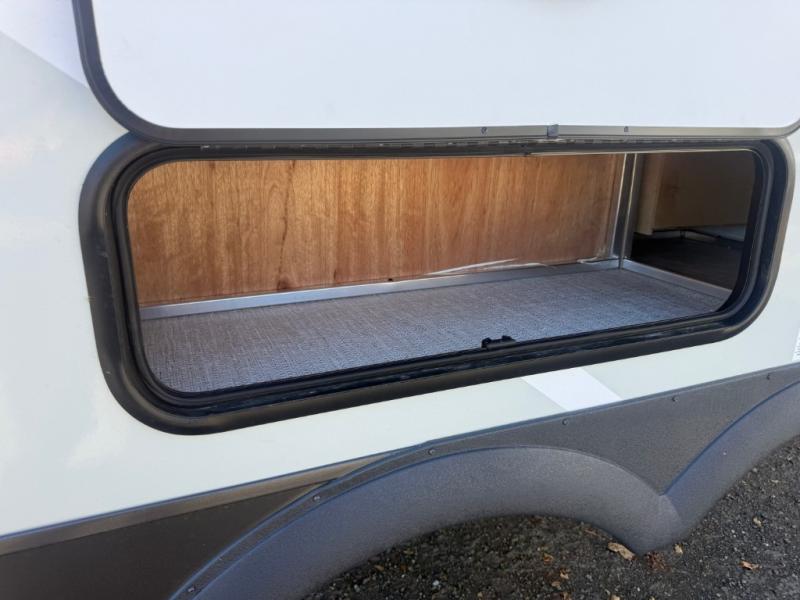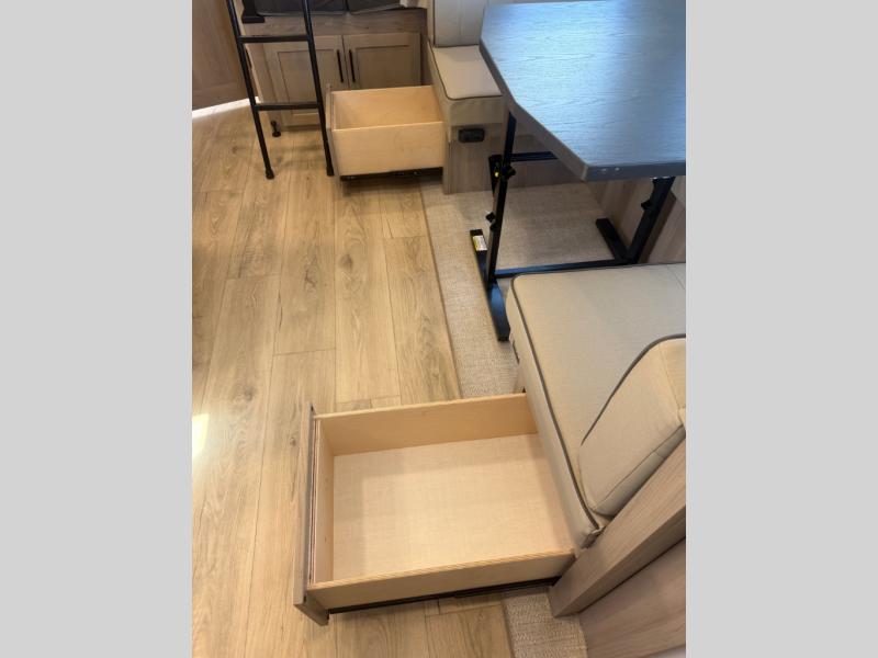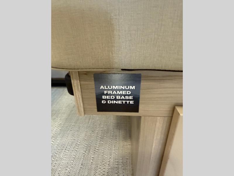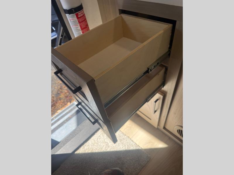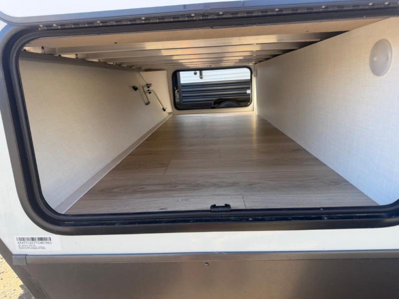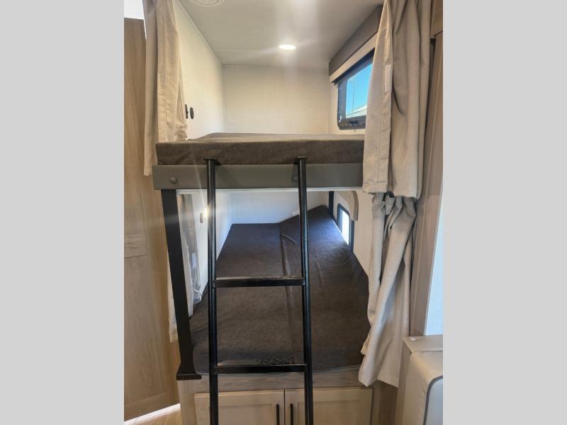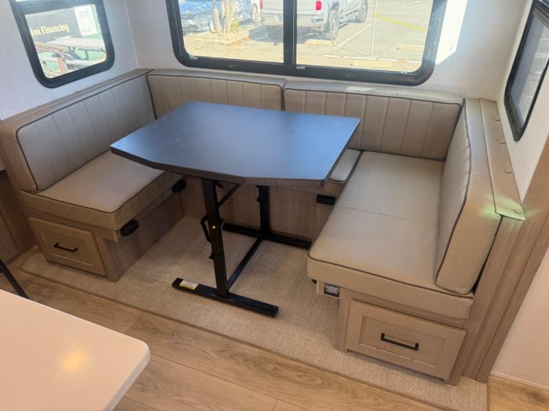 Camping in this single slide out travel trailer will make weekends at the campground comfy and hassle-free! Once you arrive, you can unload the pass-through storage, put out the 18' power awning, then make lunch on the exterior griddle. There is also a full interior kitchen to make meals when the weather isn't cooperating. Everyone can gather around the U-shaped dinette slide for meal times or game night, and there is a spacious pantry where you can store snacks! The bunk beds include a flip-up bottom bunk and an exterior bike door so you can easily pack camp gear away, and the full bath is right next to the bunks for easy nighttime use. Head up front to enjoy your own private bedroom with an RV queen bed, dual wardrobes, and flip-up storage!
