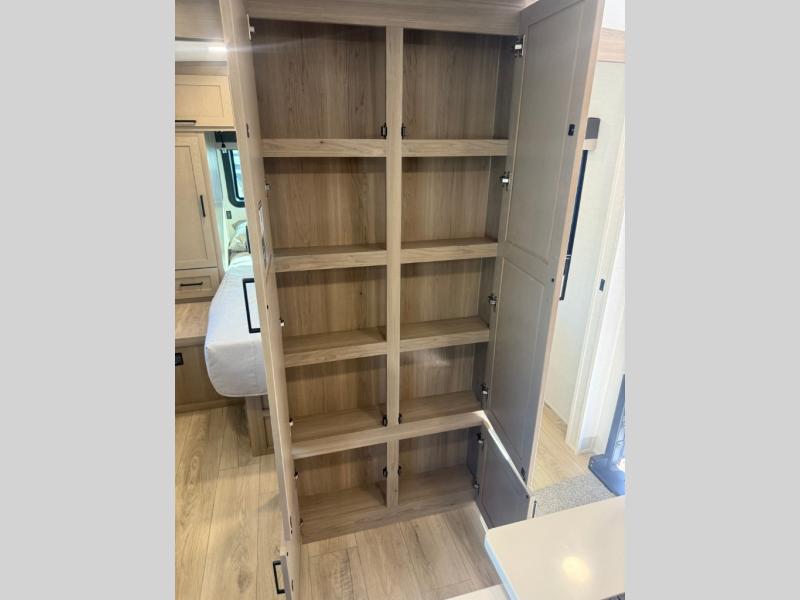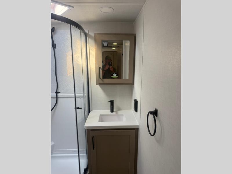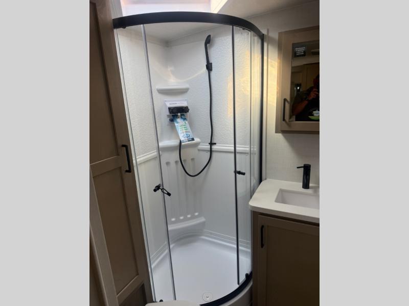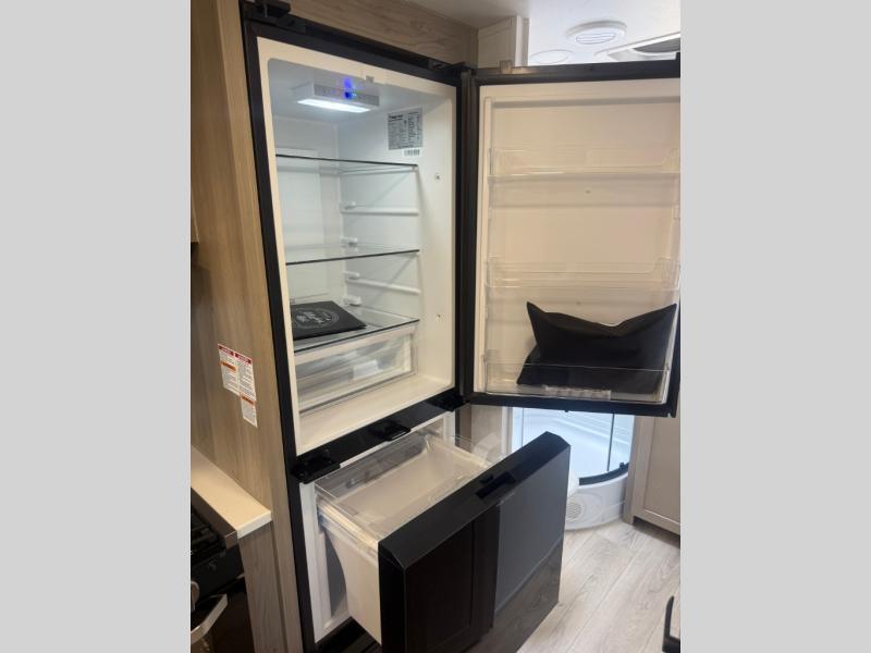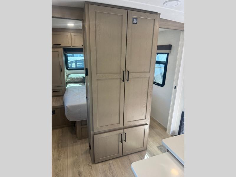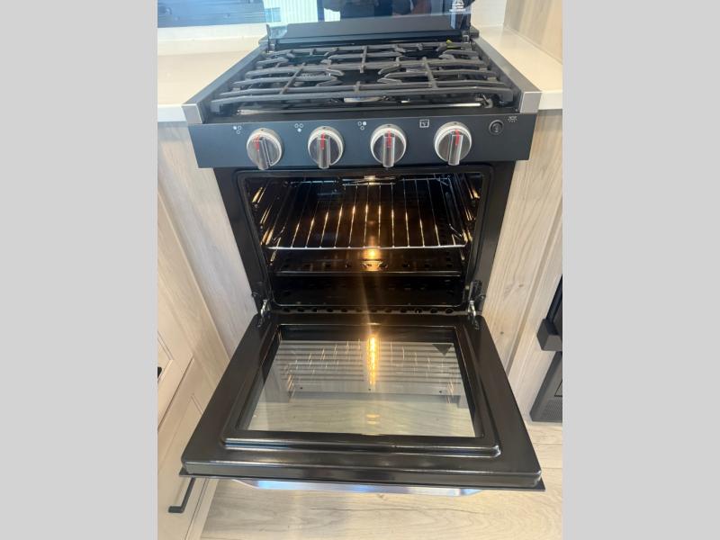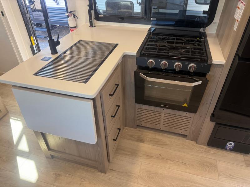 Camping in this single slide out travel trailer will make weekends at the campground comfy and hassle-free! Once you arrive, you can unload the pass-through storage, put out the 18' power awning, then make lunch on the exterior griddle. There is also a full interior kitchen to make meals when the weather isn't cooperating. Everyone can gather around the U-shaped dinette slide for meal times or game night, and there is a spacious pantry where you can store snacks! The bunk beds include a flip-up bottom bunk and an exterior bike door so you can easily pack camp gear away, and the full bath is right next to the bunks for easy nighttime use. Head up front to enjoy your own private bedroom with an RV queen bed, dual wardrobes, and flip-up storage!