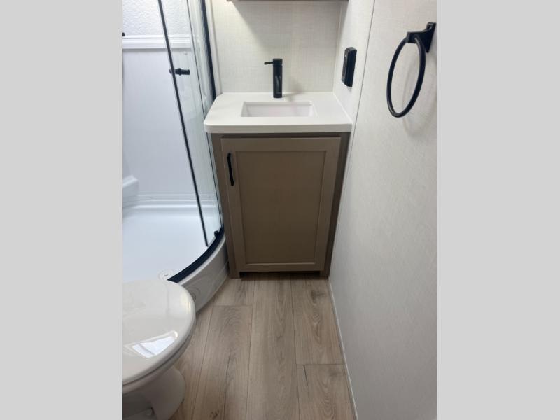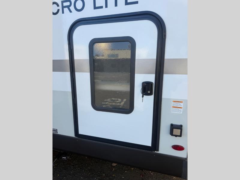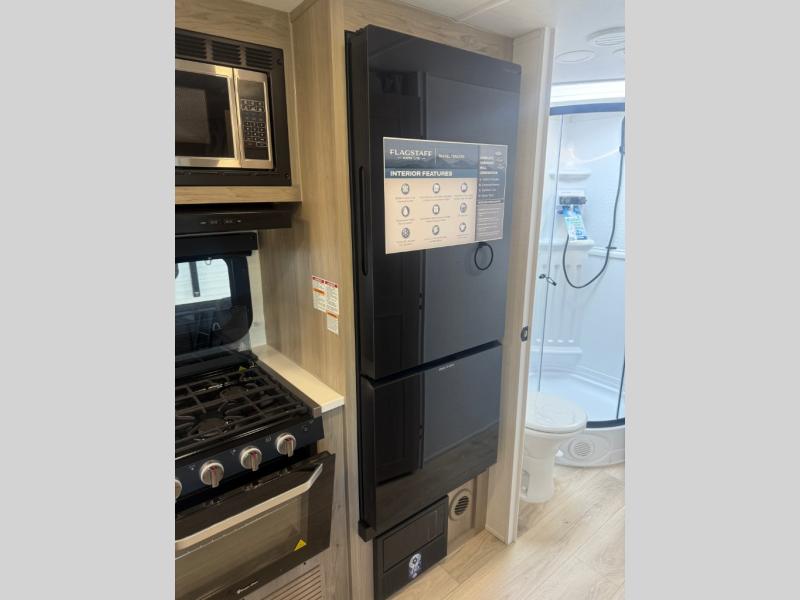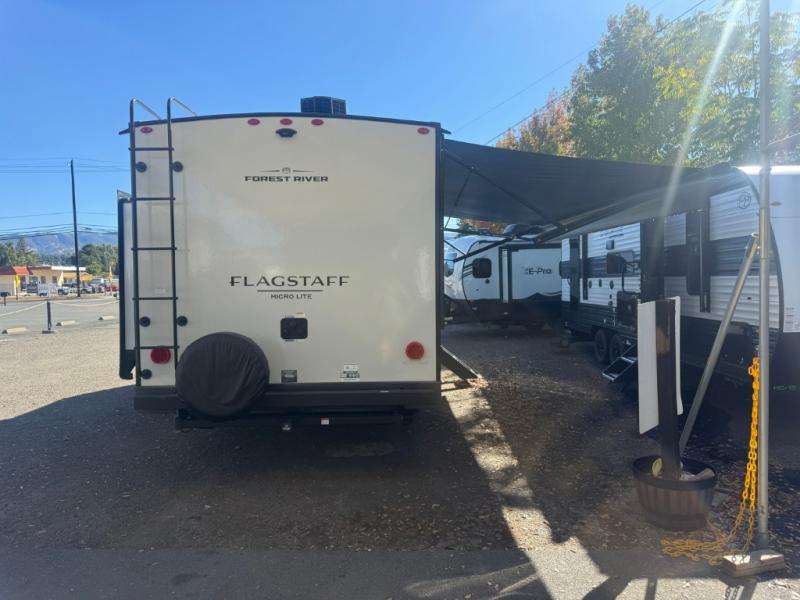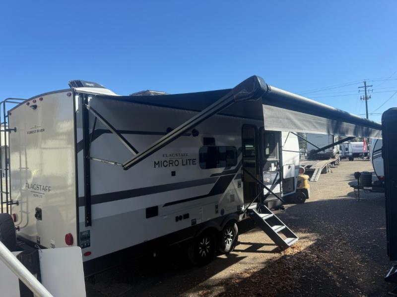With any Flagstaff Micro Lite travel trailer by Forest River you will enjoy lightweight towing, durable construction, and added interior comforts to make each trip memorable! Each model features a torsion axle, Rubber-Ryde suspension, nitrogen filled, Goodyear Endurance tires, and easy lube axles with Nev-R-Adjust brakes for smooth towing from home to campground. The 6-sided aluminum framed construction provides a strong foundation so you can enjoy your RV for years to come, plus electronically controlled heated holding tanks and an enclosed underbelly will let you camp all year long. Head inside to find hybrid woven flooring in the slide outs, Sedona wood cabinetry, solid surface kitchen countertops, and many more amenities. These travel trailers also include exterior conveniences for hassle-free camping, like the power tongue jack, magnetic compartment door catches, Keyed Alike locks, and rear ladder to name a few!