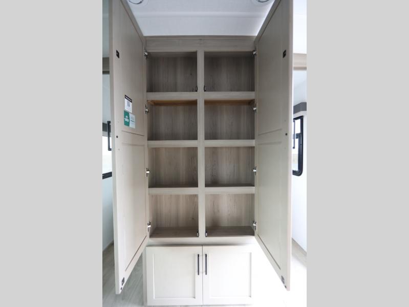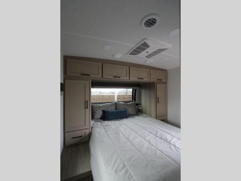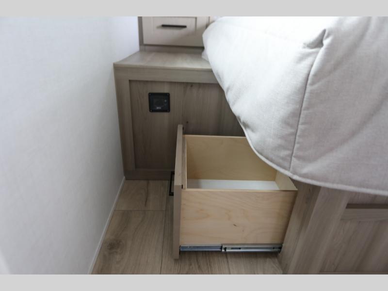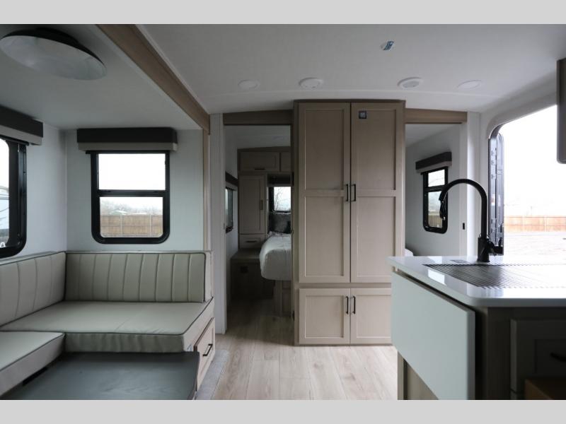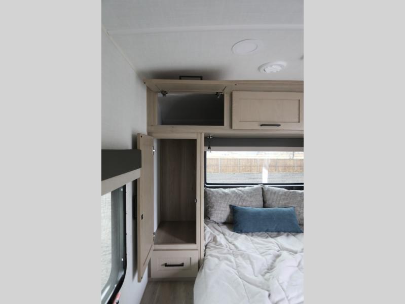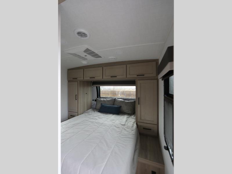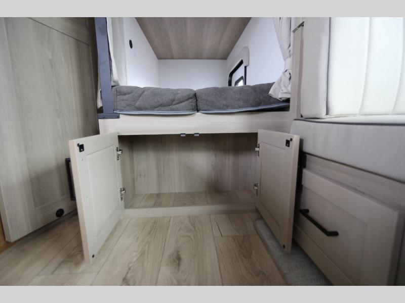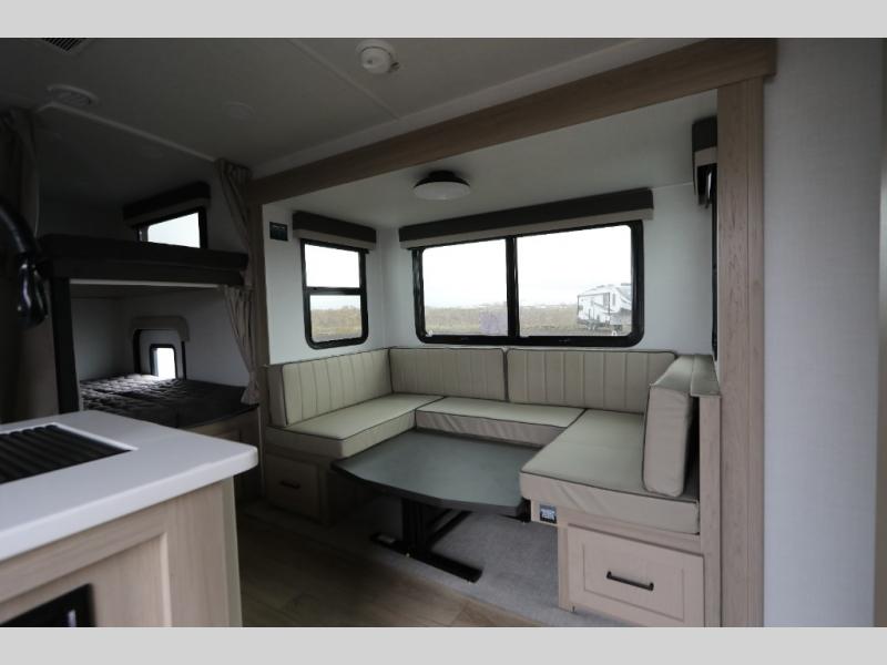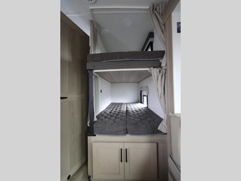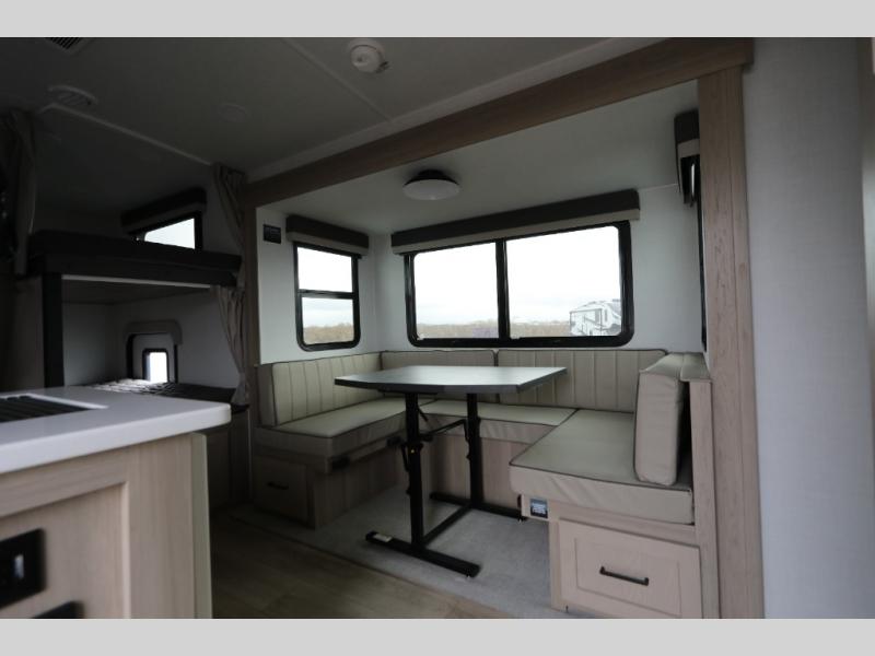 Camping in this single slide out travel trailer will make weekends at the campground comfy and hassle-free! Once you arrive, you can unload the pass-through storage, put out the 18' power awning, then relax in your camp chairs. And there is a full interior kitchen to make meals when you get hungry. Everyone can gather around the U-shaped dinette slide for meal times or game night, and there is a spacious pantry where you can store snacks! The bunk beds include a flip-up bottom bunk and an exterior bike door so you can easily pack camp gear away, and the full bath is right next to the bunks for easy nighttime use. Head up front to enjoy your own private bedroom with an RV queen bed, dual wardrobes, and flip-up storage!