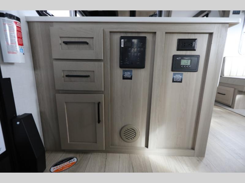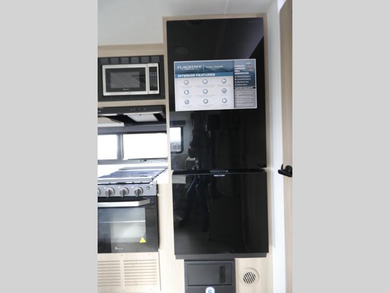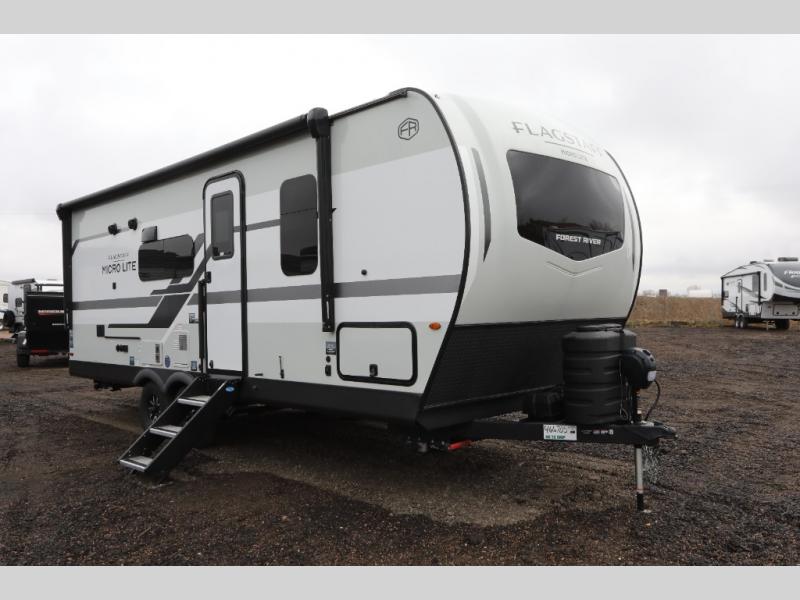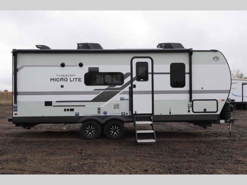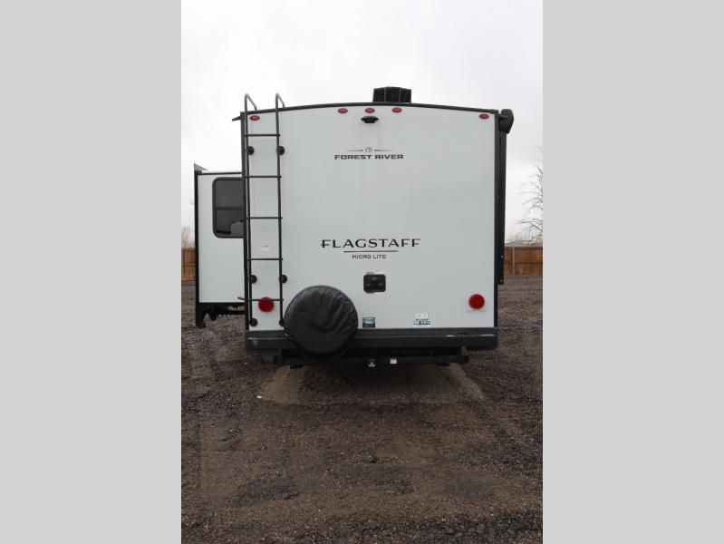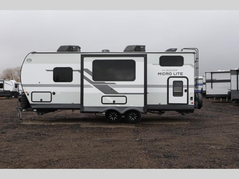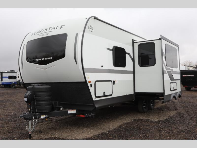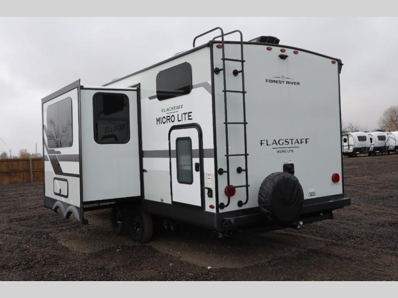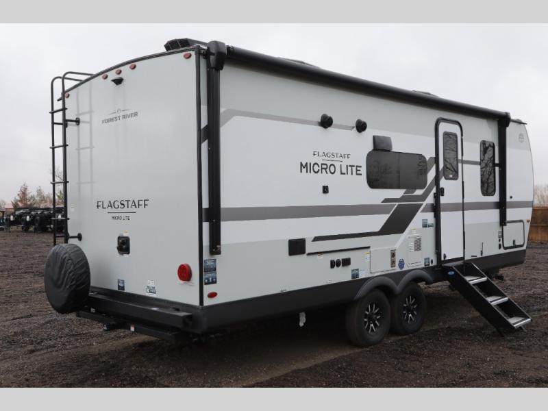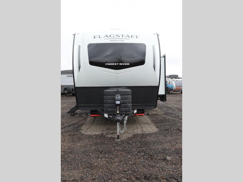 With any Flagstaff Micro Lite travel trailer by Forest River you will enjoy lightweight towing, durable construction, and added interior comforts to make each trip memorable! Each model features RoadTech tire pressure monitoring, Dexter Torflex axles, and nitrogen-filled Goodyear endurance tires for smooth towing from home to campground. The 6-sided aluminum framed construction provides a strong foundation so you can enjoy your RV for years to come, plus the radiant foil in the front cap, underbelly and slides help insulate your trailer. Additional exterior features include a 200W solar panel, back-up camera prep, frameless windows, and slam baggage doors. Each model includes the Great Expectations Package with roller shades, solid surface kitchen countertops, and hidden hinge cabinet doors. There is also an exterior hot/cold water port, outside speakers, a power tongue jack and stabilizer jacks, plus many more conveniences.