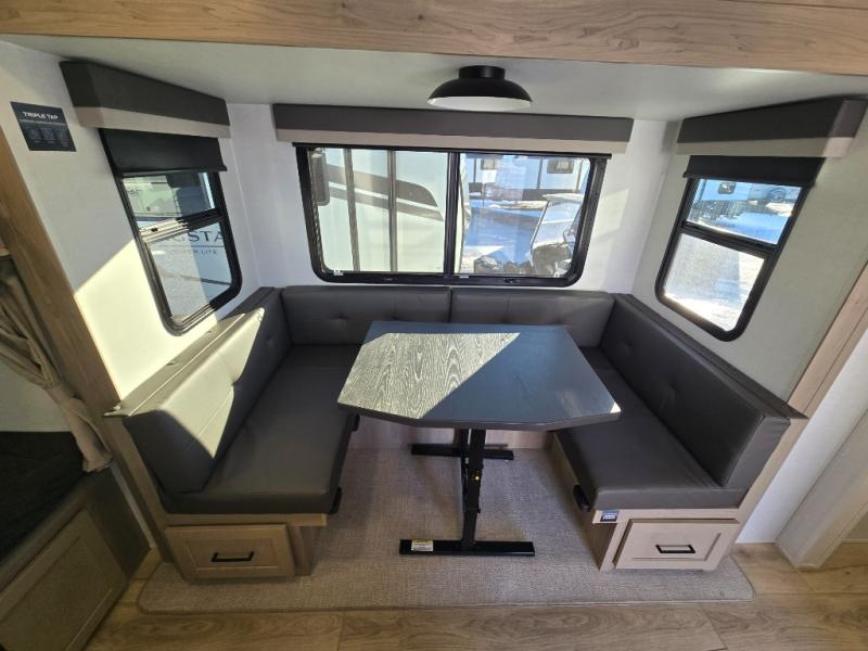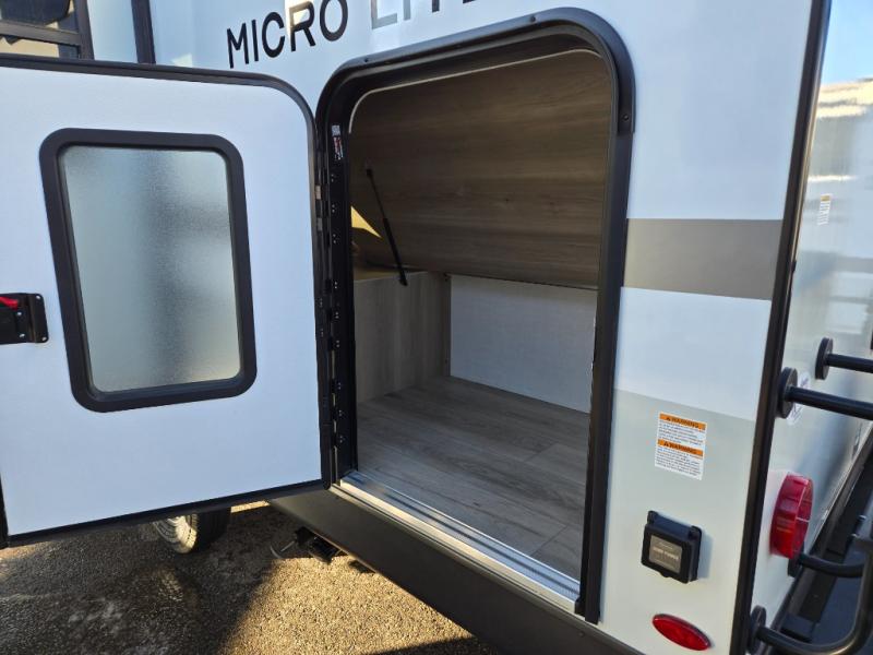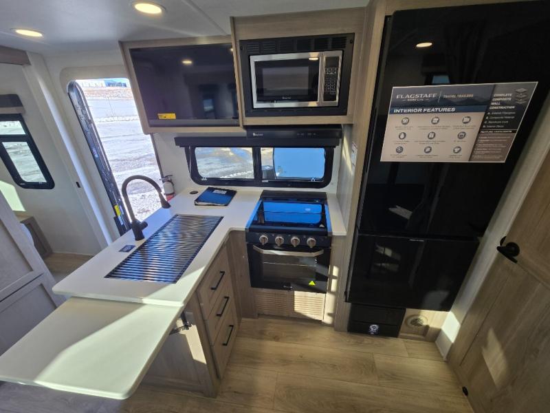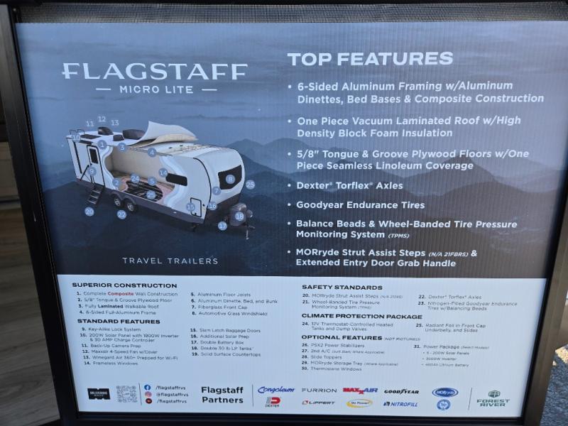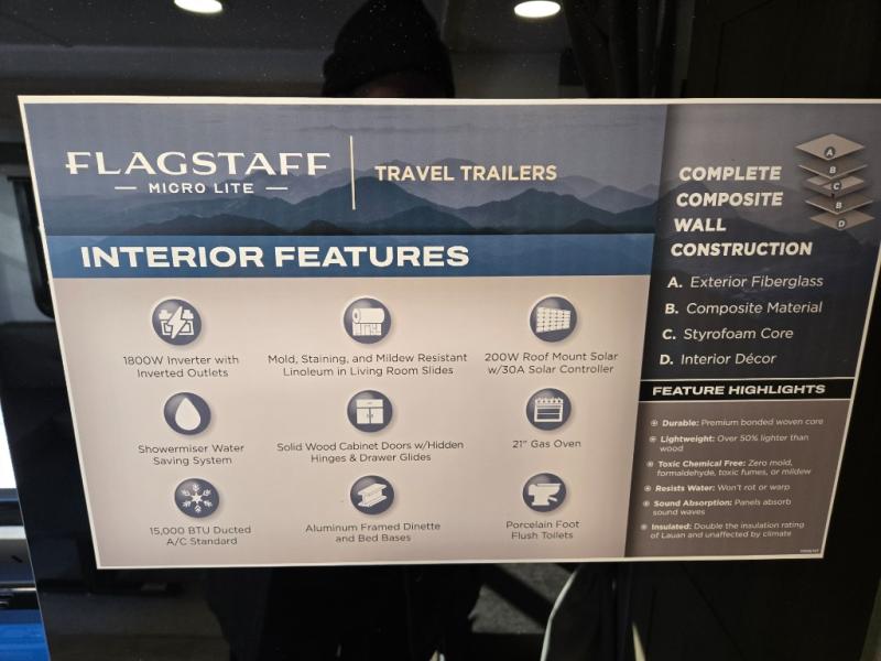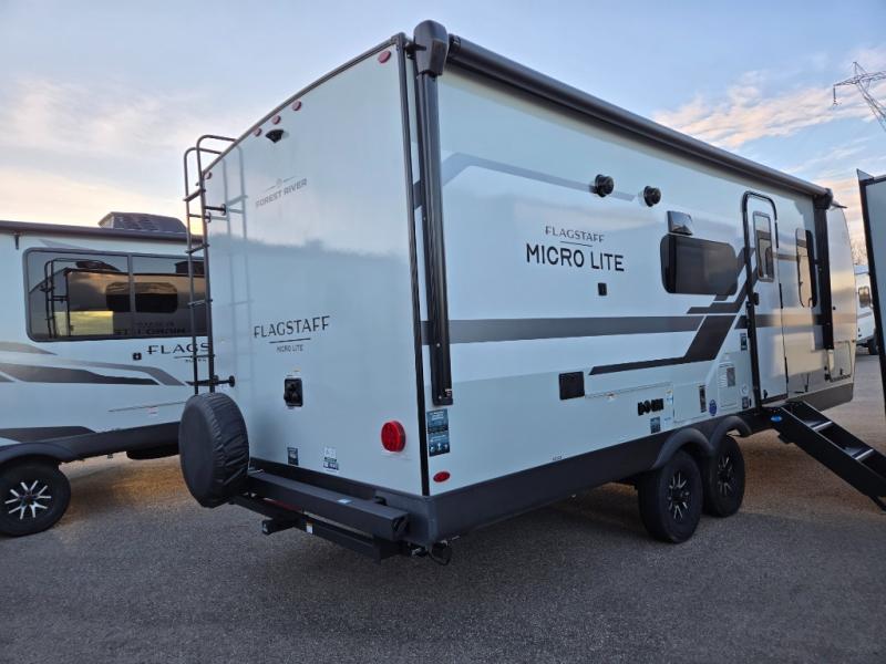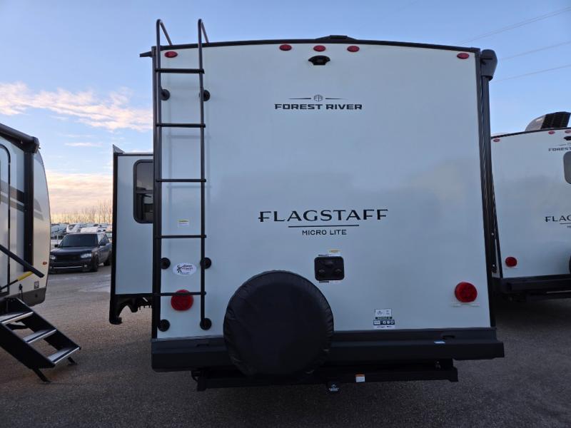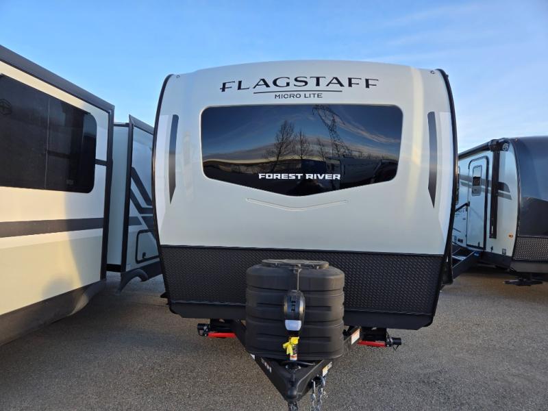 With any Flagstaff Micro Lite travel trailer by Forest River you will enjoy lightweight towing, durable construction, and added interior comforts to make each trip memorable! Each model features RoadTech tire pressure monitoring, Dexter Torflex axles, and nitrogen-filled Goodyear endurance tires for smooth towing from home to campground. The 6-sided aluminum framed construction provides a strong foundation so you can enjoy your RV for years to come, plus the radiant foil in the front cap, underbelly and slides help insulate your trailer. Additional exterior features include a 200W solar panel, back-up camera prep, frameless windows, and slam baggage doors. Each model includes the Great Expectations Package with roller shades, solid surface kitchen countertops, and hidden hinge cabinet doors. There is also an exterior hot/cold water port, outside speakers, a power tongue jack and stabilizer jacks, plus many more conveniences.