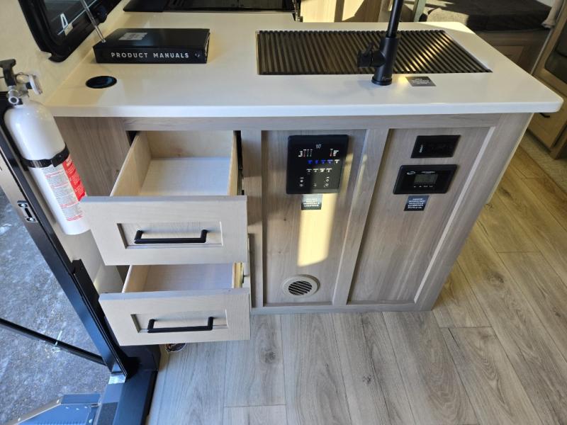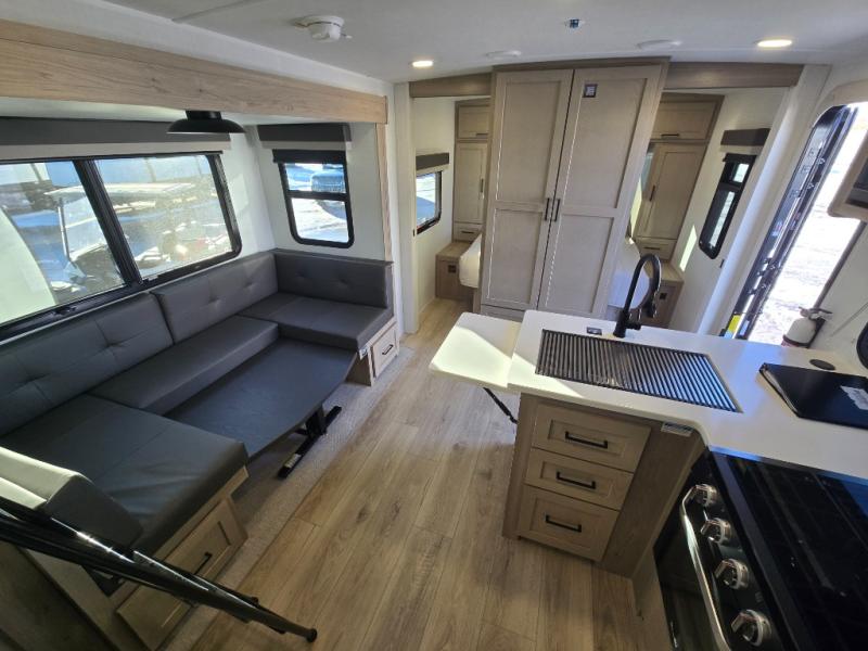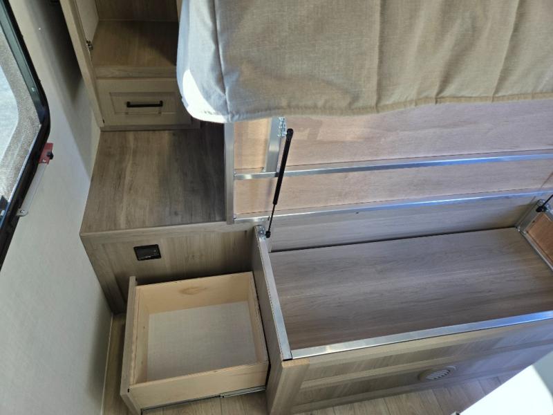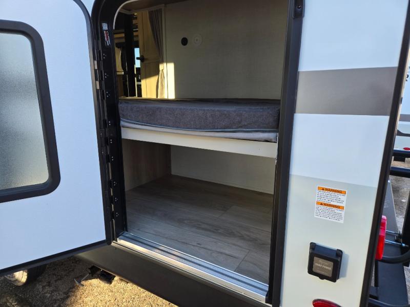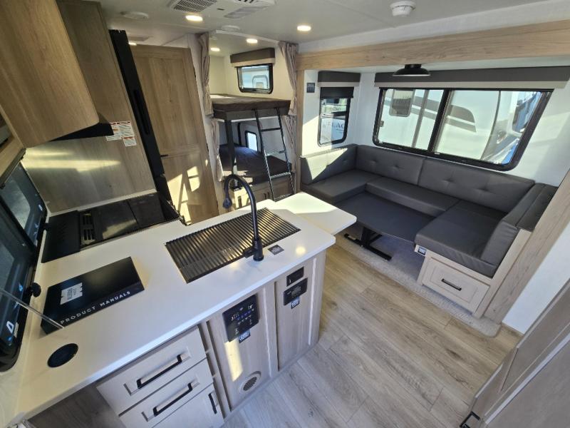 Camping in this single slide out travel trailer will make weekends at the campground comfy and hassle-free! Once you arrive, you can unload the pass-through storage, put out the 18' power awning, then relax in your camp chairs. And there is a full interior kitchen to make meals when you get hungry. Everyone can gather around the U-shaped dinette slide for meal times or game night, and there is a spacious pantry where you can store snacks! The bunk beds include a flip-up bottom bunk and an exterior bike door so you can easily pack camp gear away, and the full bath is right next to the bunks for easy nighttime use. Head up front to enjoy your own private bedroom with an RV queen bed, dual wardrobes, and flip-up storage!