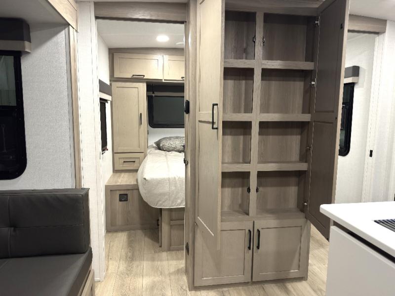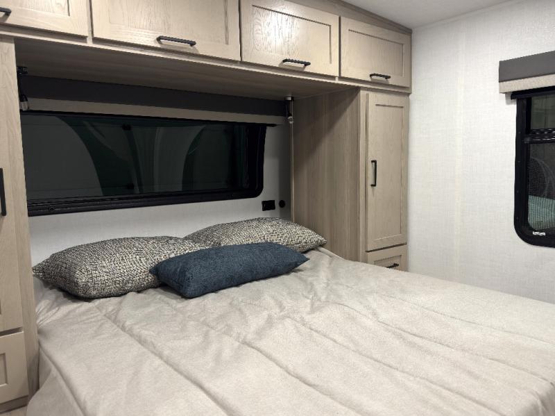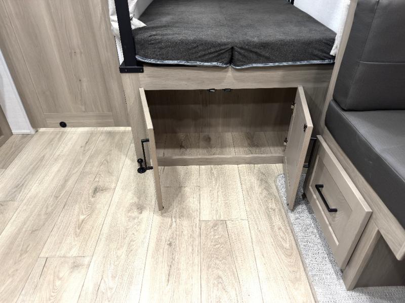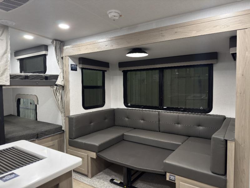 Camping in this single slide out travel trailer will make weekends at the campground comfy and hassle-free! Once you arrive, you can unload the pass-through storage, put out the 18' power awning, then relax in your camp chairs. And there is a full interior kitchen to make meals when you get hungry. Everyone can gather around the U-shaped dinette slide for meal times or game night, and there is a spacious pantry where you can store snacks! The bunk beds include a flip-up bottom bunk and an exterior bike door so you can easily pack camp gear away, and the full bath is right next to the bunks for easy nighttime use. Head up front to enjoy your own private bedroom with an RV queen bed, dual wardrobes, and flip-up storage!
