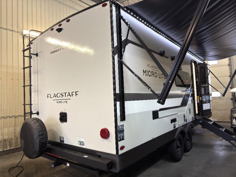 With any Flagstaff Micro Lite travel trailer by Forest River you will enjoy lightweight towing, durable construction, and added interior comforts to make each trip memorable! Each model features RoadTech tire pressure monitoring, Dexter Torflex axles, and nitrogen-filled Goodyear endurance tires for smooth towing from home to campground. The 6-sided aluminum framed construction provides a strong foundation so you can enjoy your RV for years to come, plus the radiant foil in the front cap, underbelly and slides help insulate your trailer. Additional exterior features include a 200W solar panel, back-up camera prep, frameless windows, and slam baggage doors. Each model includes the Great Expectations Package with roller shades, solid surface kitchen countertops, and hidden hinge cabinet doors. There is also an exterior hot/cold water port, outside speakers, a power tongue jack and stabilizer jacks, plus many more conveniences.