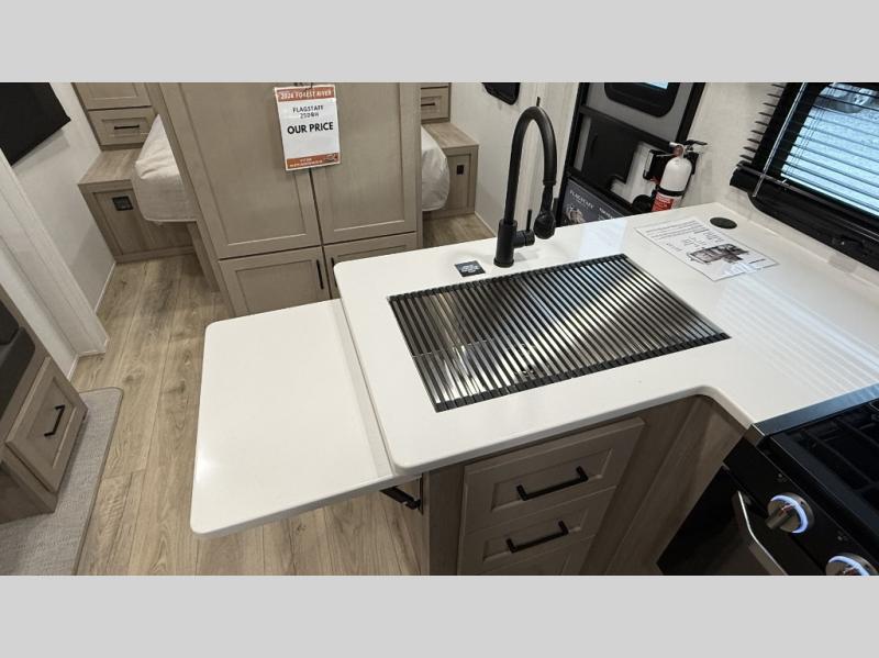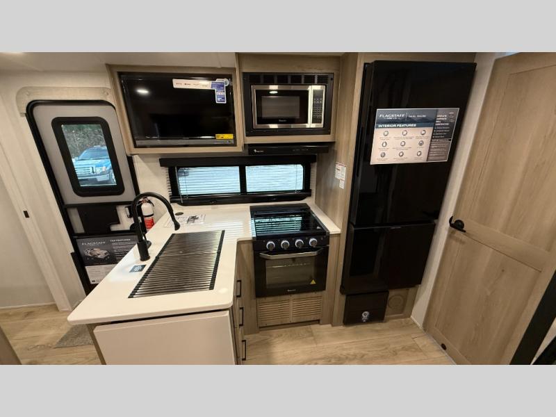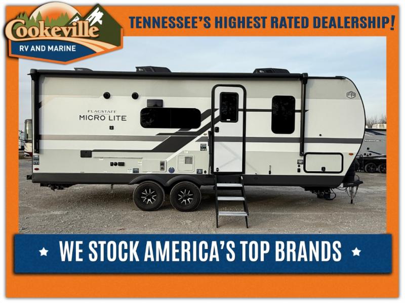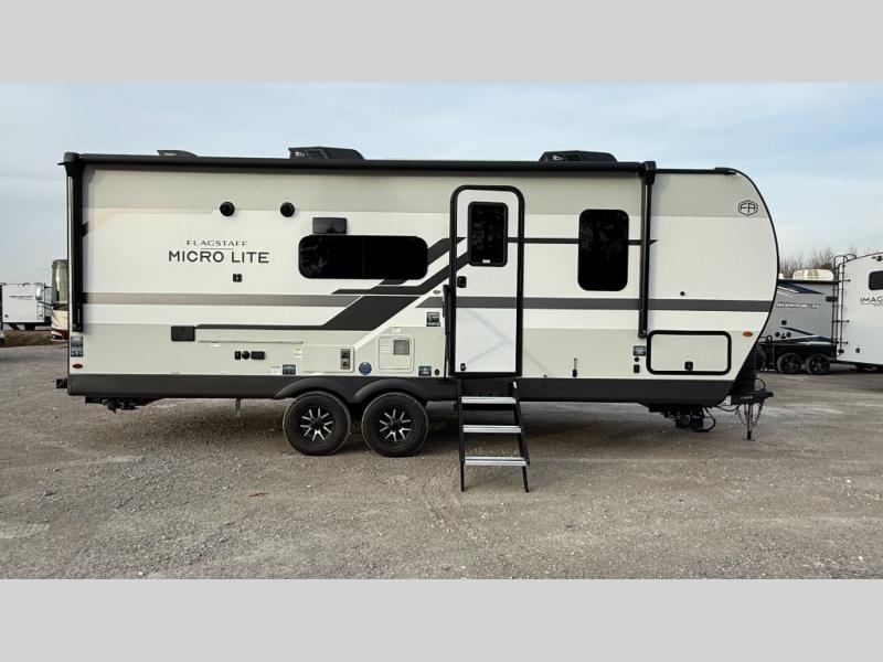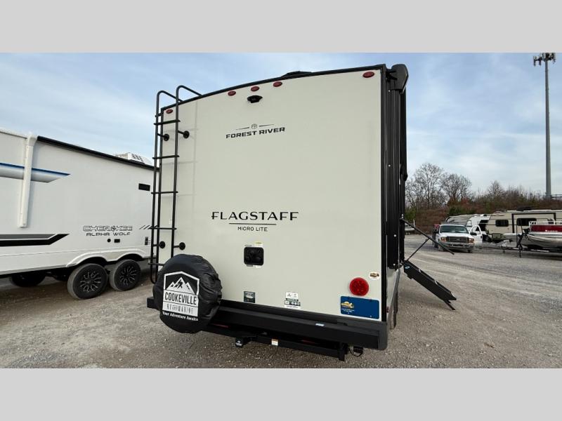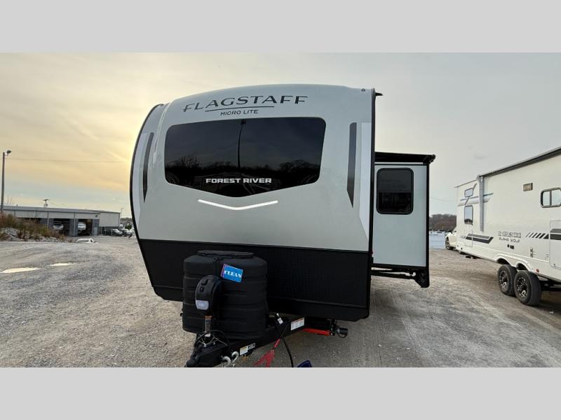 With any Flagstaff Micro Lite travel trailer by Forest River you will enjoy lightweight towing, durable construction, and added interior comforts to make each trip memorable! Each model features RoadTech tire pressure monitoring, Dexter Torflex axles, and nitrogen-filled Goodyear endurance tires for smooth towing from home to campground. The 6-sided aluminum framed construction provides a strong foundation so you can enjoy your RV for years to come, plus the radiant foil in the front cap, underbelly and slides help insulate your trailer. Additional exterior features include a 200W solar panel, back-up camera prep, frameless windows, and slam baggage doors. Each model includes the Great Expectations Package with roller shades, solid surface kitchen countertops, and hidden hinge cabinet doors. There is also an exterior hot/cold water port, outside speakers, a power tongue jack and stabilizer jacks, plus many more conveniences.