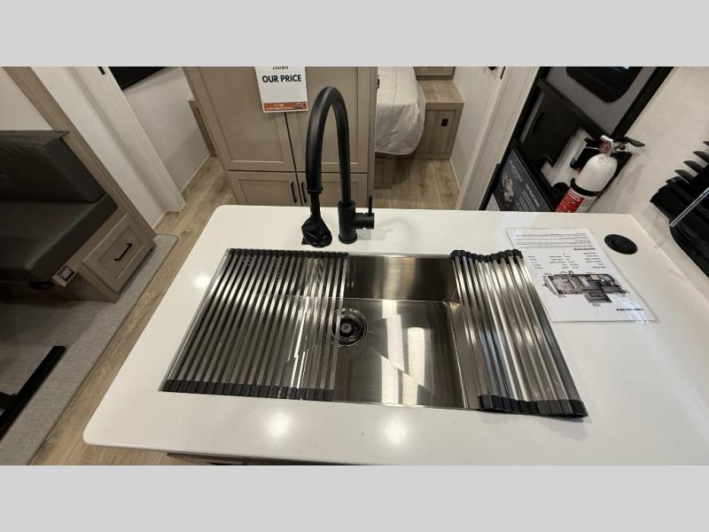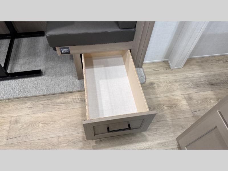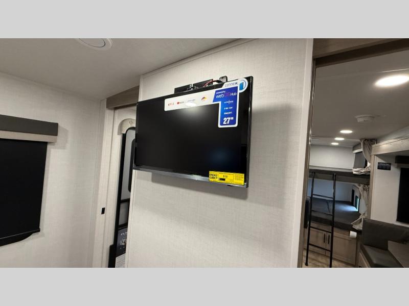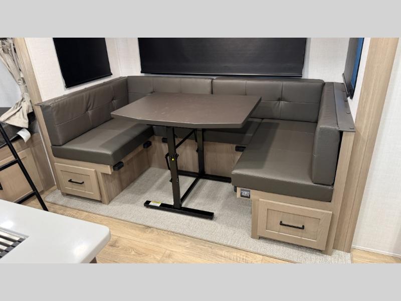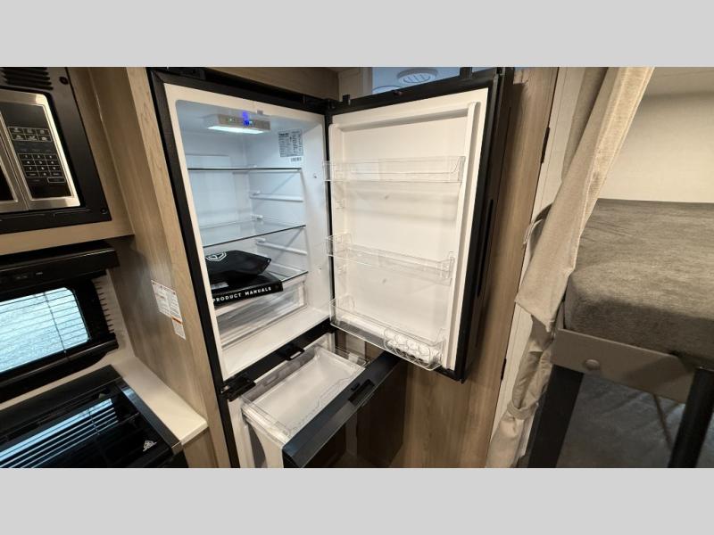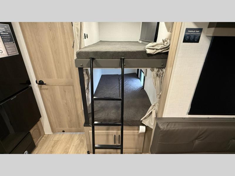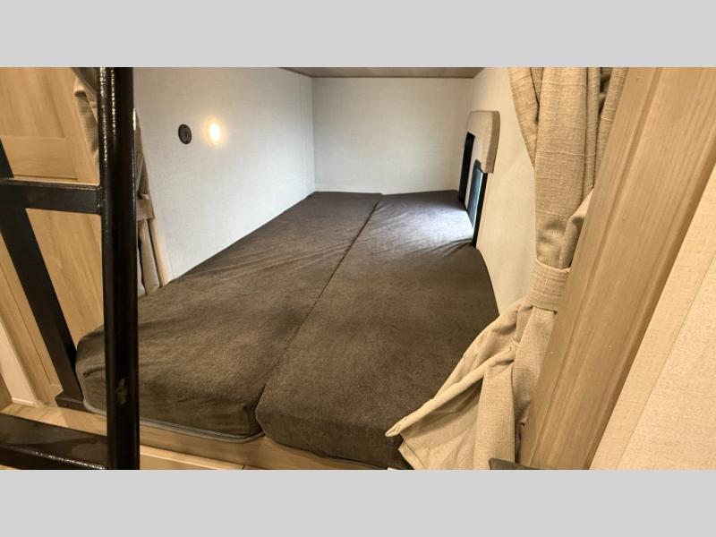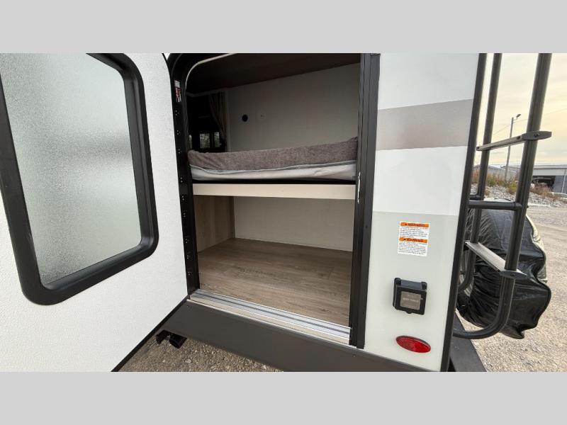 Camping in this single slide out travel trailer will make weekends at the campground comfy and hassle-free! Once you arrive, you can unload the pass-through storage, put out the 18' power awning, then relax in your camp chairs. And there is a full interior kitchen to make meals when you get hungry. Everyone can gather around the U-shaped dinette slide for meal times or game night, and there is a spacious pantry where you can store snacks! The bunk beds include a flip-up bottom bunk and an exterior bike door so you can easily pack camp gear away, and the full bath is right next to the bunks for easy nighttime use. Head up front to enjoy your own private bedroom with an RV queen bed, dual wardrobes, and flip-up storage!