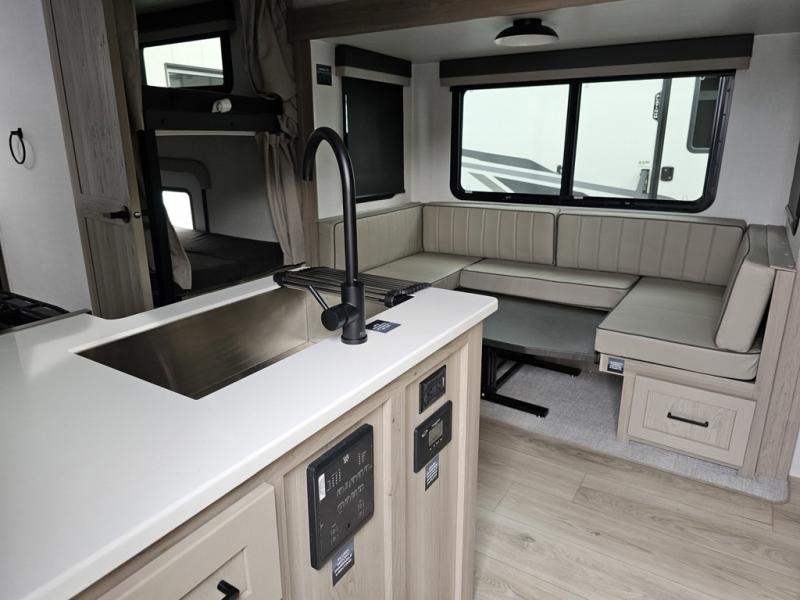 Camping in this single slide out travel trailer will make weekends at the campground comfy and hassle-free! Once you arrive, you can unload the pass-through storage, put out the 18' power awning, then relax in your camp chairs. And there is a full interior kitchen to make meals when you get hungry. Everyone can gather around the U-shaped dinette slide for meal times or game night, and there is a spacious pantry where you can store snacks! The bunk beds include a flip-up bottom bunk and an exterior bike door so you can easily pack camp gear away, and the full bath is right next to the bunks for easy nighttime use. Head up front to enjoy your own private bedroom with an RV queen bed, dual wardrobes, and flip-up storage!